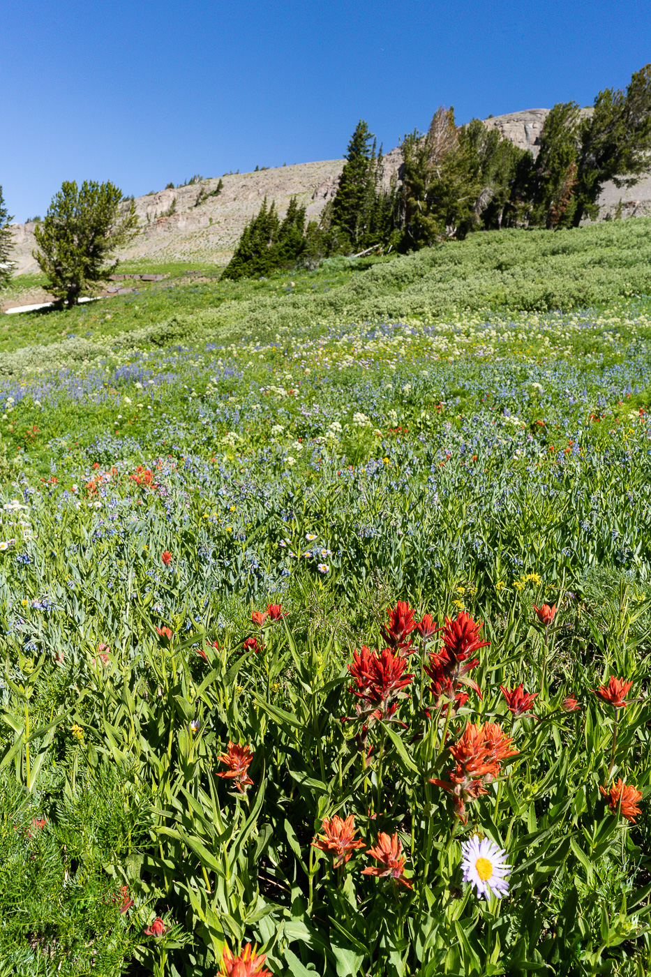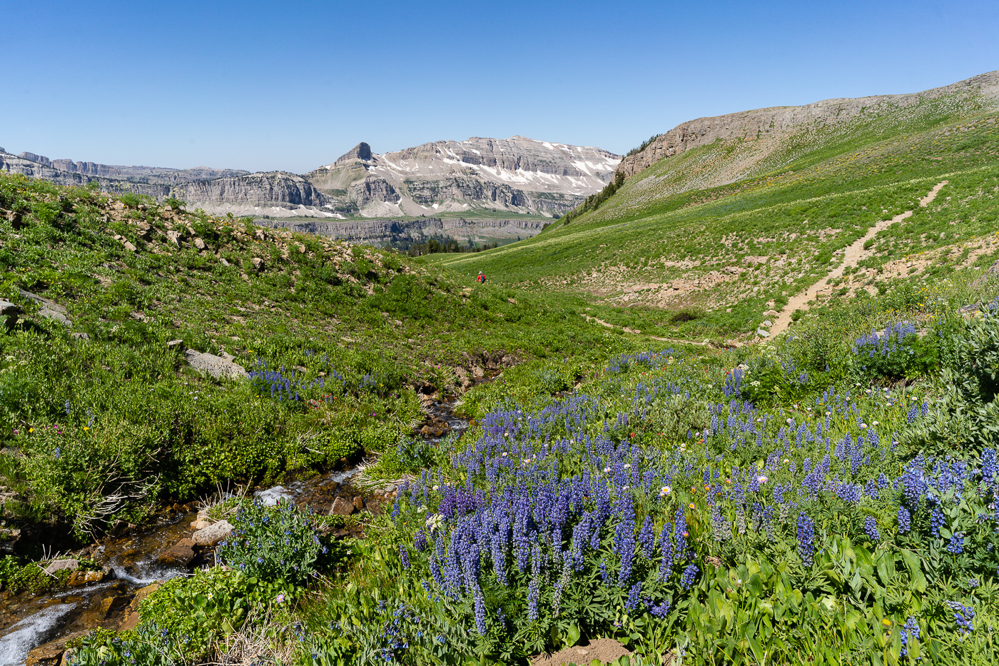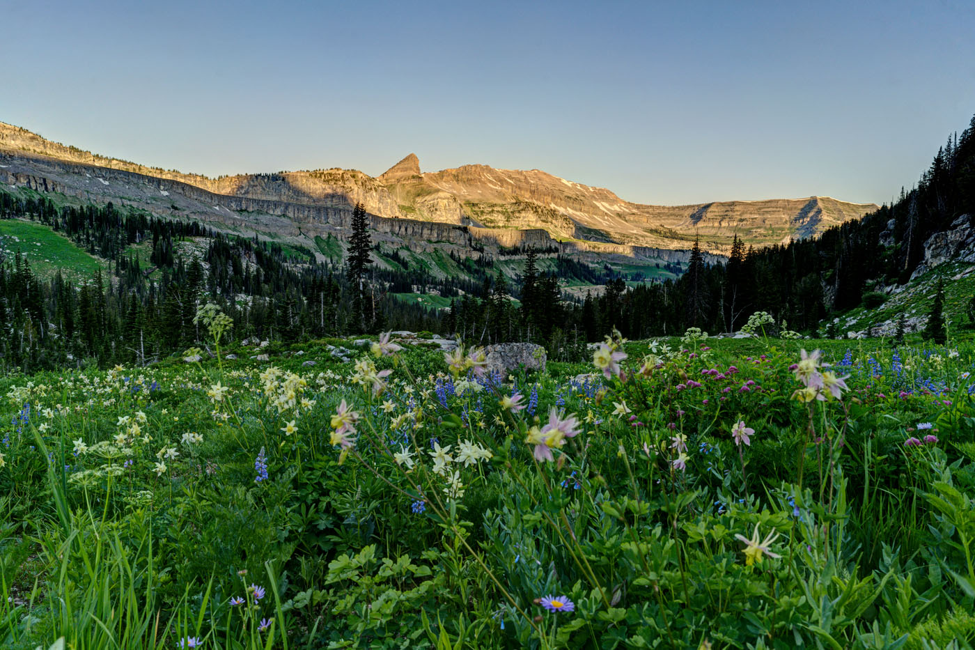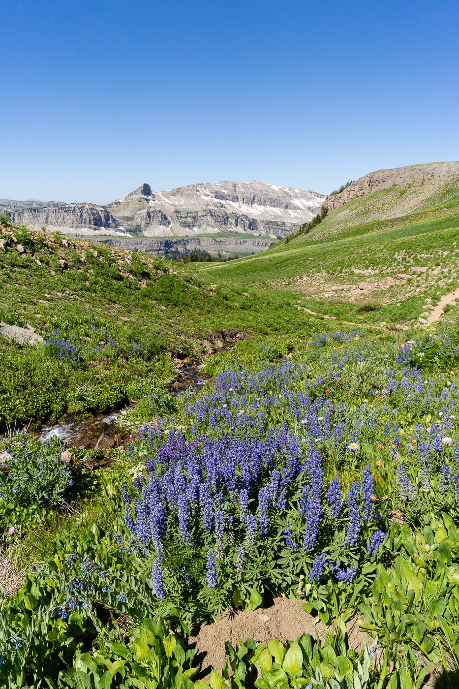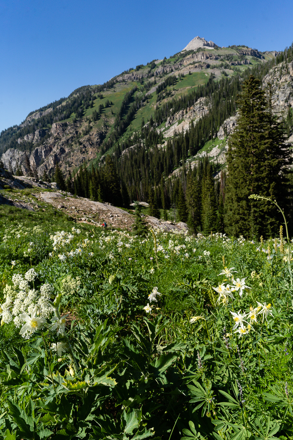 The trail starts at the South Teton Canyon Trailhead east of Driggs, Idaho. The first 2 miles meanders by the creek and is fairly flat. Then the fun starts. The trail climbs steadily through four or five meadows that filled with wildflowers. The views of the surrounding mountains are good as well here. At mile 2.7, the trail intersects with the trail to the Devil’s Stairs on the right. This side trail makes a loop with the main trail up at the basin if you so desire. We met several people doing the entire 16 miles in a day. The main trail continues steeply upward from this point. It climbs above the creek and enters a pine forest. Around mile 4.5, the trail ascends steep switchbacks and arroiuves at a meadow filled with columbine and cow parsnip. The trail levels off at this point and crosses the creek at mile 5.4. This crossing is a little tricky, especially on the way back. Watch for loose logs and rocks. There are two very nice cascades in this area as well.