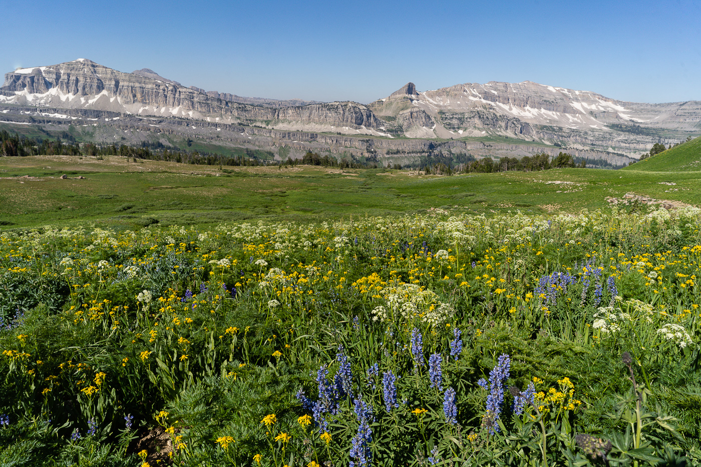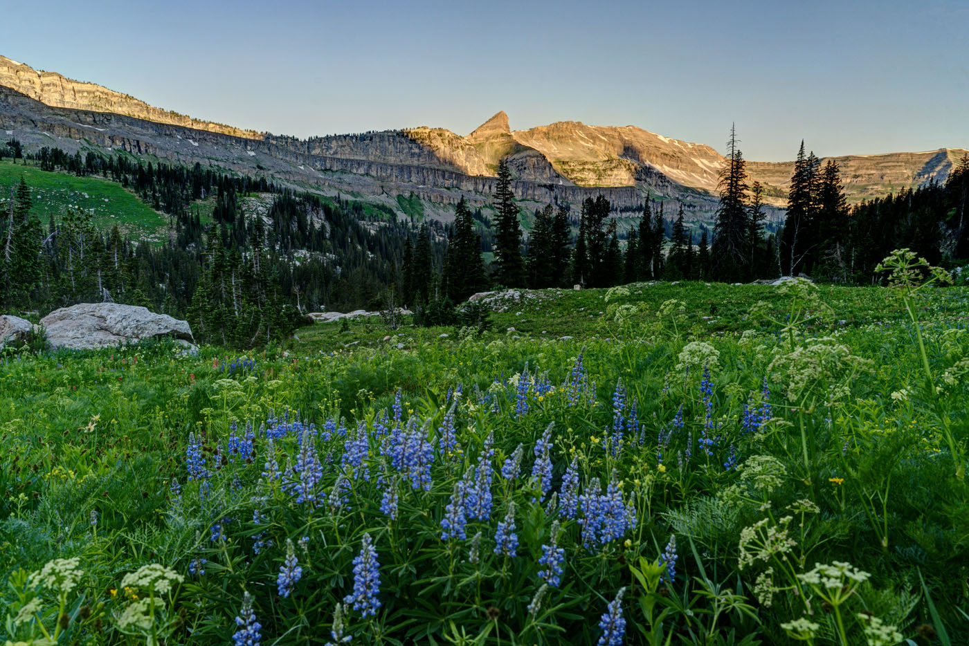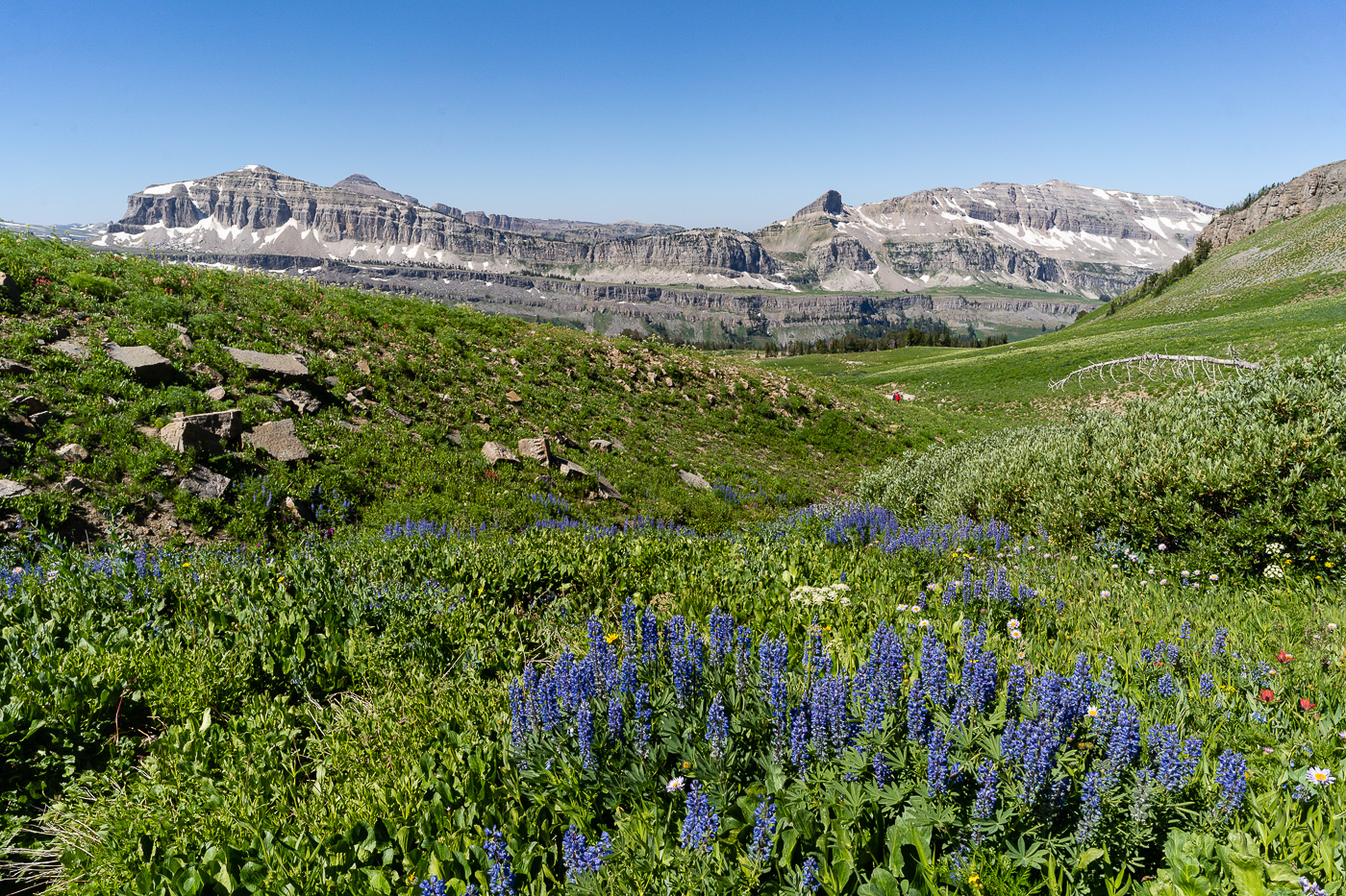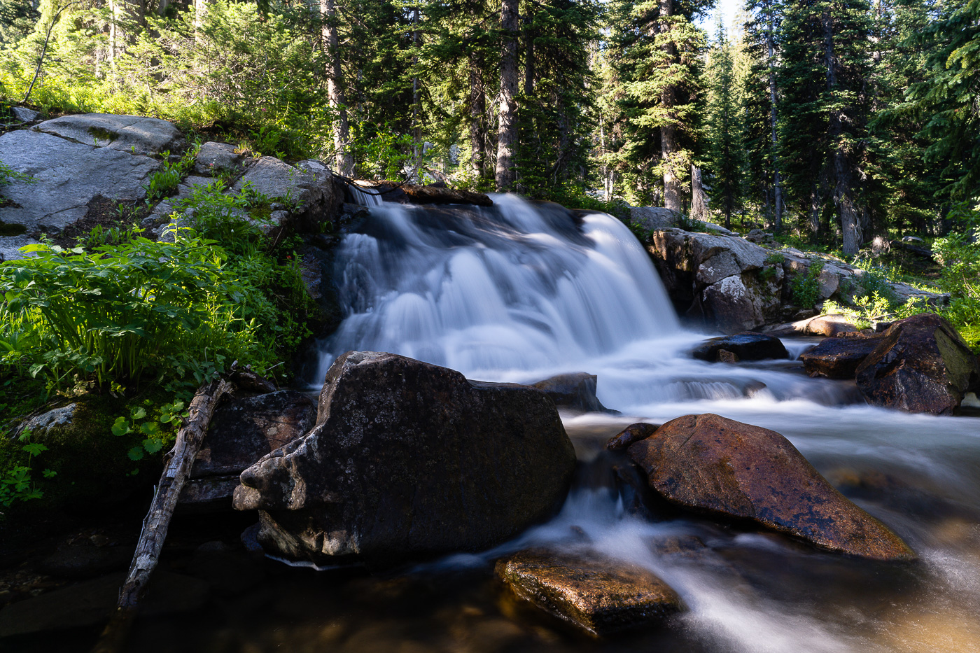 The trail starts at the South Teton Canyon Trailhead east of Driggs, Idaho. The first 2 miles meanders by the creek and is fairly flat. Then the fun starts. The trail climbs steadily through four or five meadows that filled with wildflowers. The views of the surrounding mountains are good as well here. At mile 2.7, the trail intersects with the trail to the Devil’s Stairs on the right. This side trail makes a loop with the main trail up at the basin if you so desire. We met several people doing the entire 16 miles in a day. The main trail continues steeply upward from this point. It climbs above the creek and enters a pine forest. Around mile 4.5, the trail ascends steep switchbacks and arroiuves at a meadow filled with columbine and cow parsnip. The trail levels off at this point and crosses the creek at mile 5.4. This crossing is a little tricky, especially on the way back. Watch for loose logs and rocks. There are two very nice cascades in this area as well.