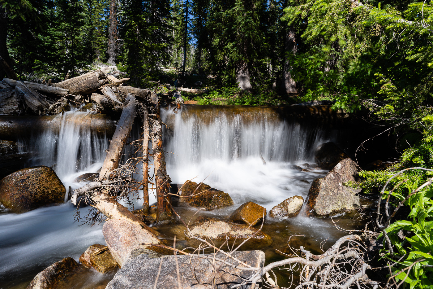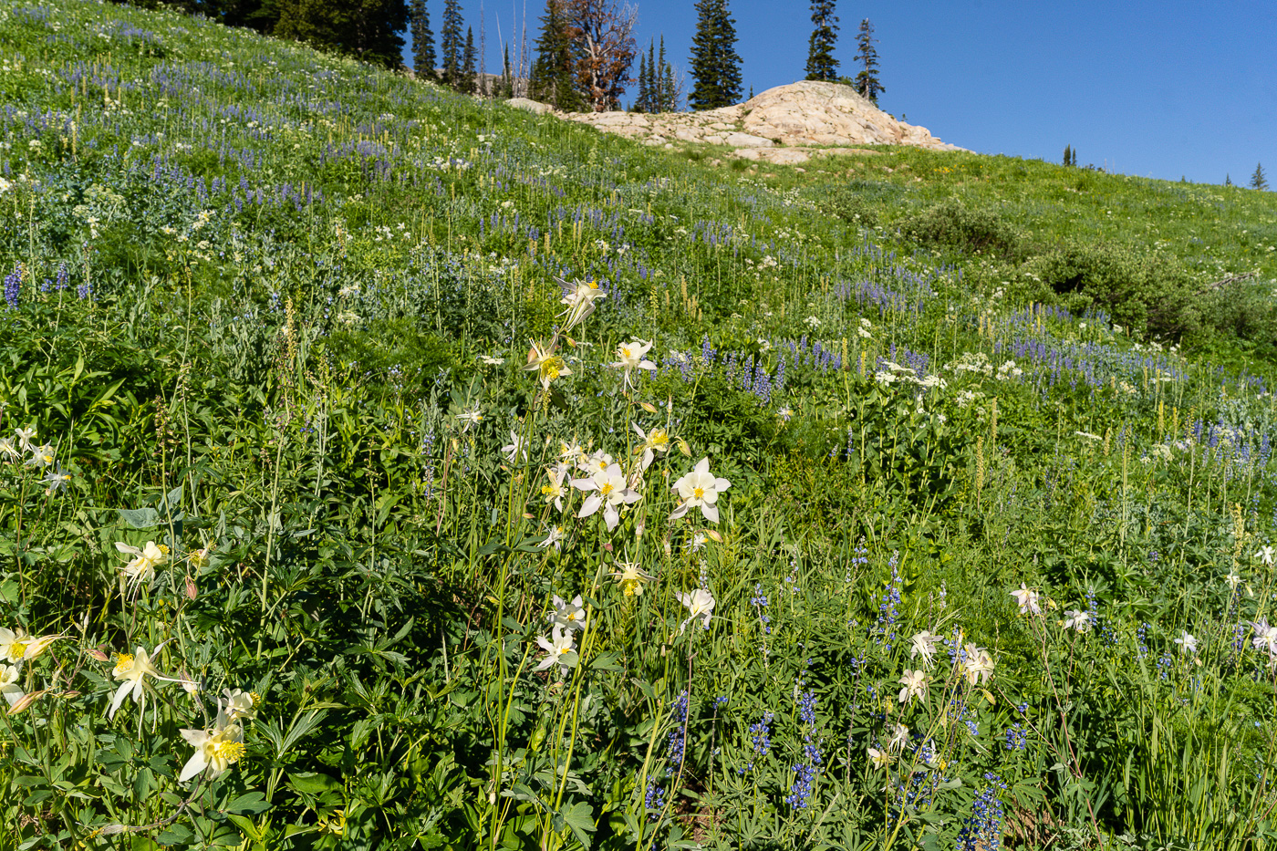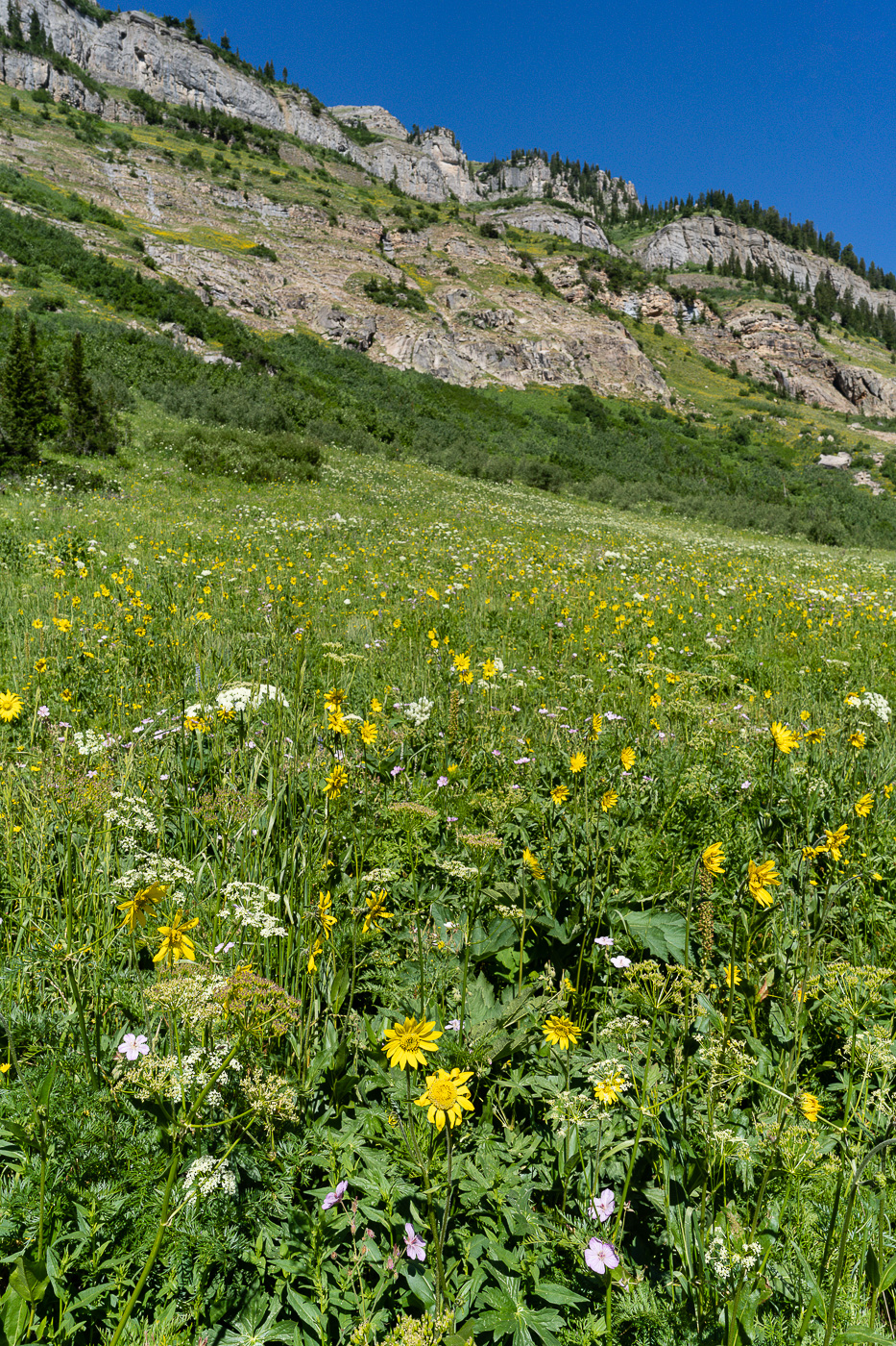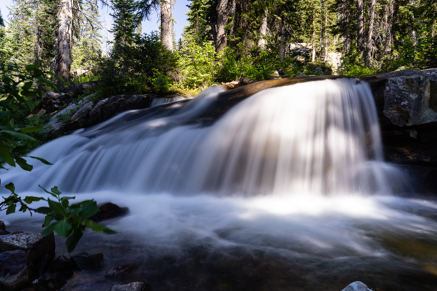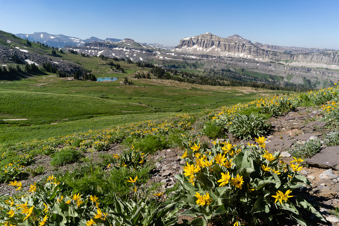The trail starts at the South Teton Canyon Trailhead east of Driggs, Idaho. The first 2 miles meanders by the creek and is fairly flat. Then the fun starts. The trail climbs steadily through four or five meadows that filled with wildflowers. The views of the surrounding mountains are good as well here. At mile 2.7, the trail intersects with the trail to the Devil’s Stairs on the right. This side trail makes a loop with the main trail up at the basin if you so desire. We met several people doing the entire 16 miles in a day. The main trail continues steeply upward from this point. It climbs above the creek and enters a pine forest. Around mile 4.5, the trail ascends steep switchbacks and arroiuves at a meadow filled with columbine and cow parsnip. The trail levels off at this point and crosses the creek at mile 5.4. This crossing is a little tricky, especially on the way back. Watch for loose logs and rocks. There are two very nice cascades in this area as well.