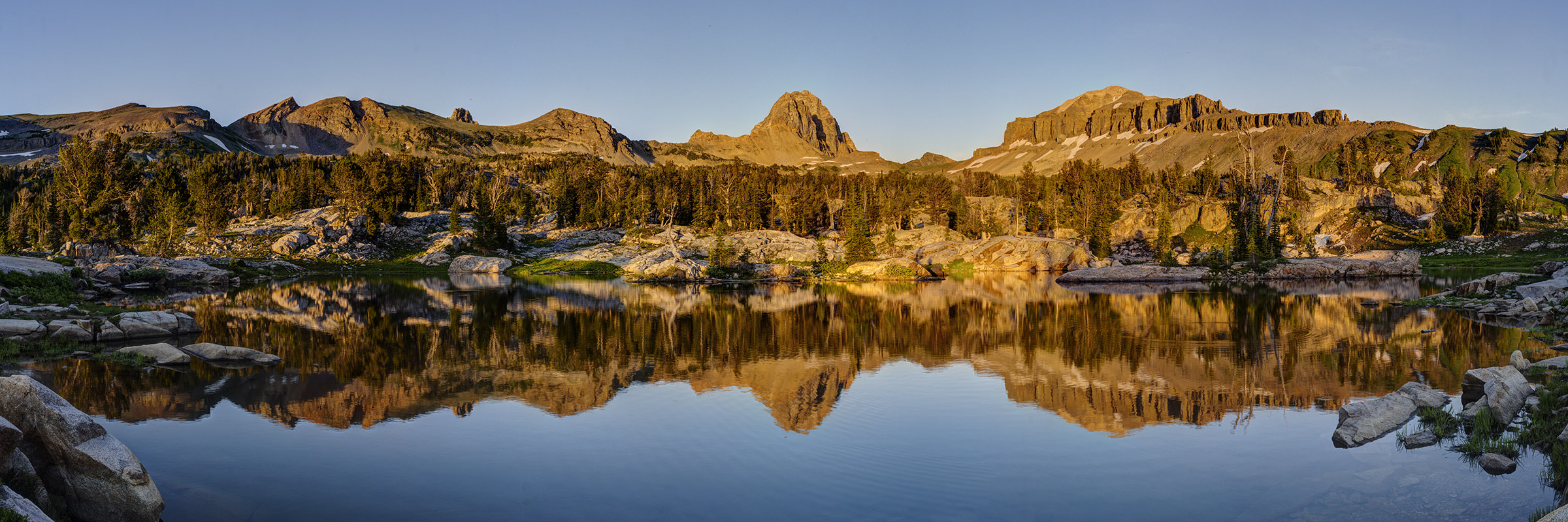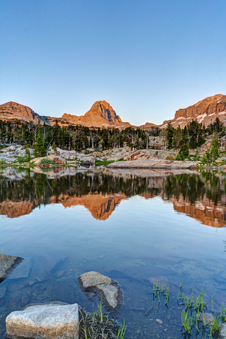 One of the amazing features of this valley is that the sun has very little blocking it as it sets to the west. Thus, the mountains behind the lakes light up and turn amber and red in the evening light. It is quite a sight to behold. The back side of South Teton dominates the scene.