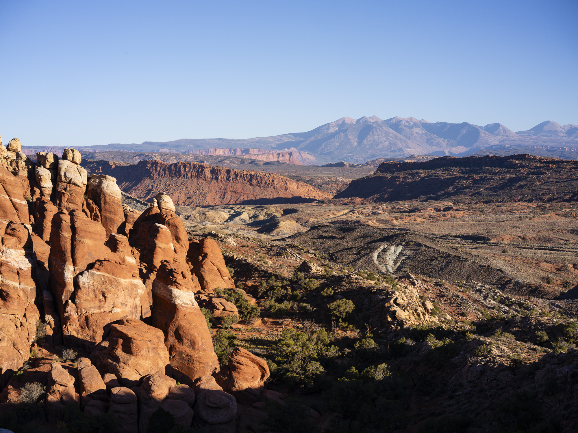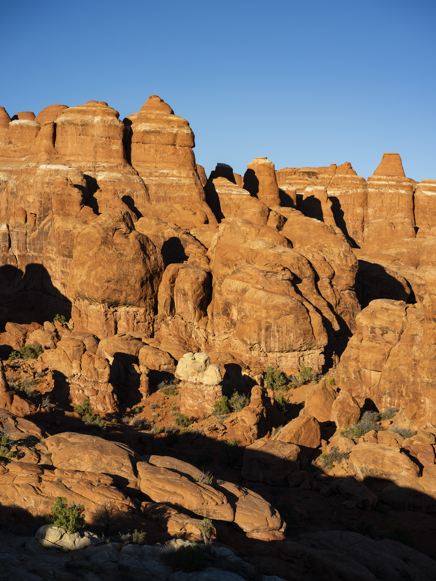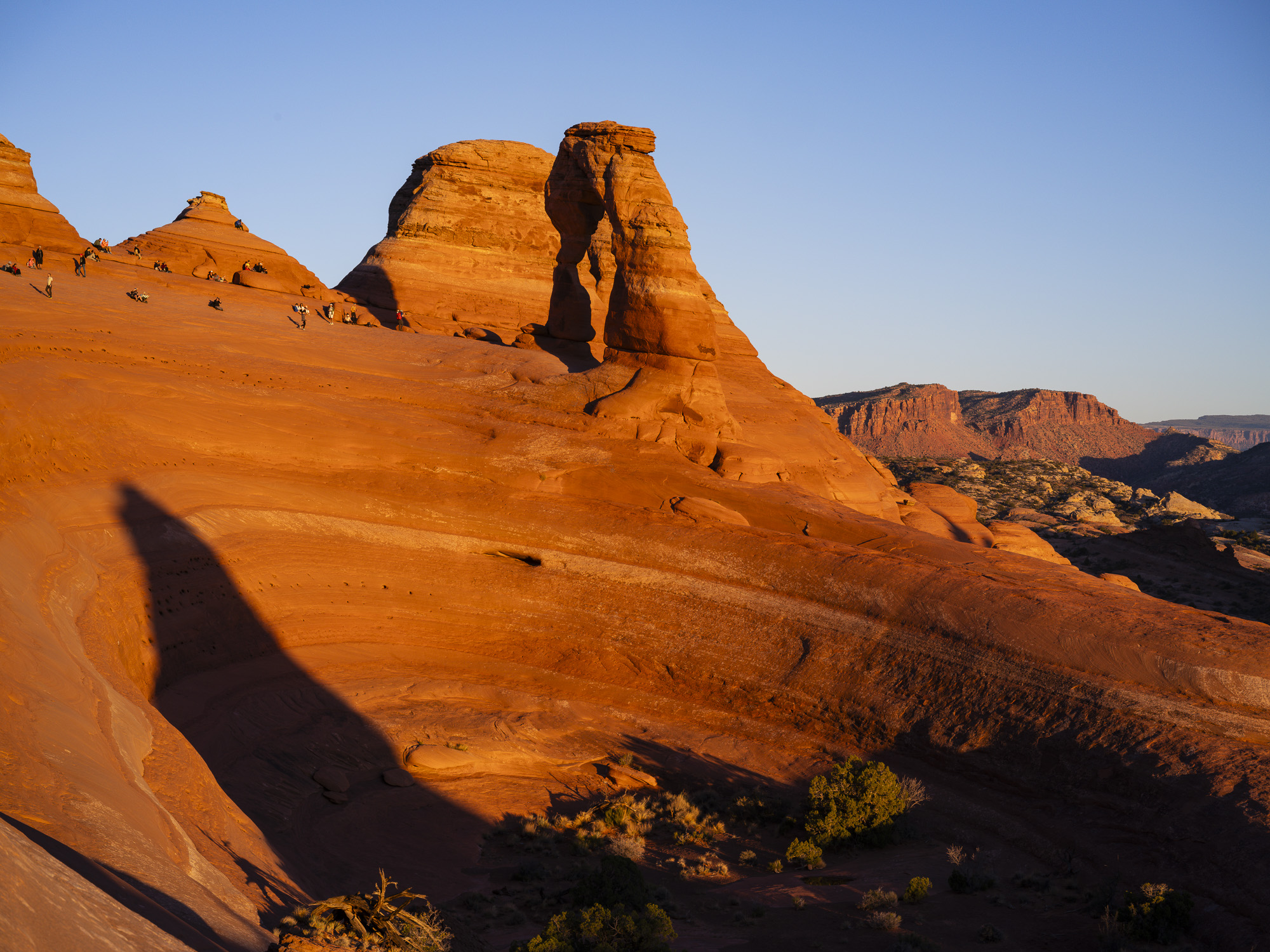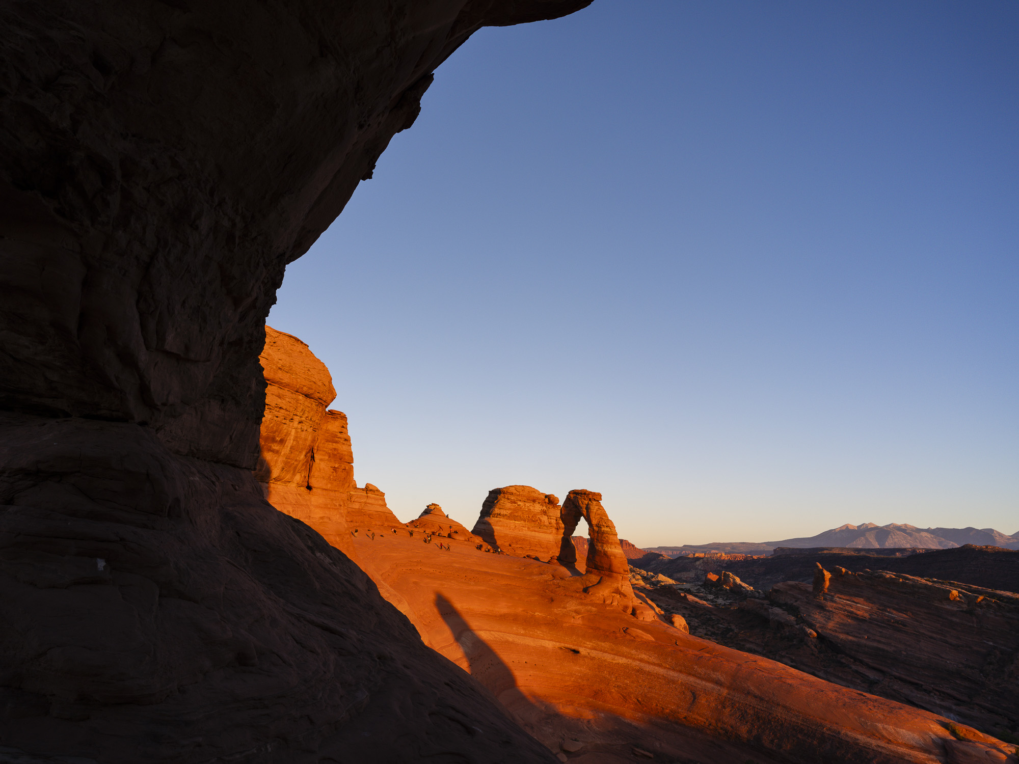 I stopped at Arches to hike up to Delicate Arch and capture the sunset before I head further west. The light was great as I had a cloudless sky. In the morning, I hiked up to Longbow Arch. This arch is accessed form the parking lot for Poison Spider Mesa. It is a challenging two-mile hike that brings you to an impressive arch that has just a crack of daylight behind it. The trail climbs steeply from the parking lot and ascends a section of steep slick rock that climbs out of a small bowl. There are iron handle grips to assist your climb in this one section. After about 1/2 mile, the trail runs sharply to the right and heads up into rocks mounds of Poison Spider Mesa. It is quite scenic through this section of trail. The trail then veers to the right in about 1 mile as it makes its approach to the arch. The trail climbs up to the base of the arch where you can watch a number of repellers come through the arch on ropes. This is an easy trail to follow with green paint splotches leading the way.