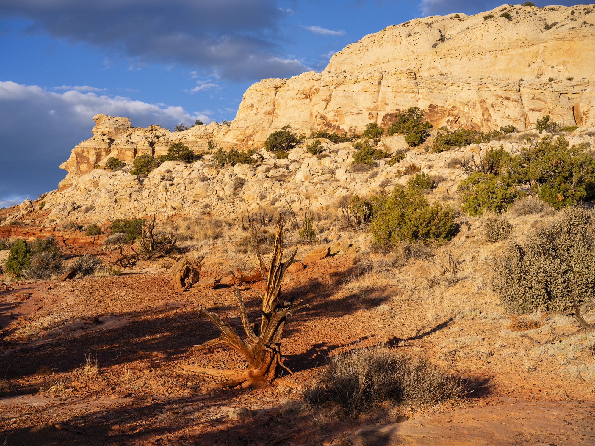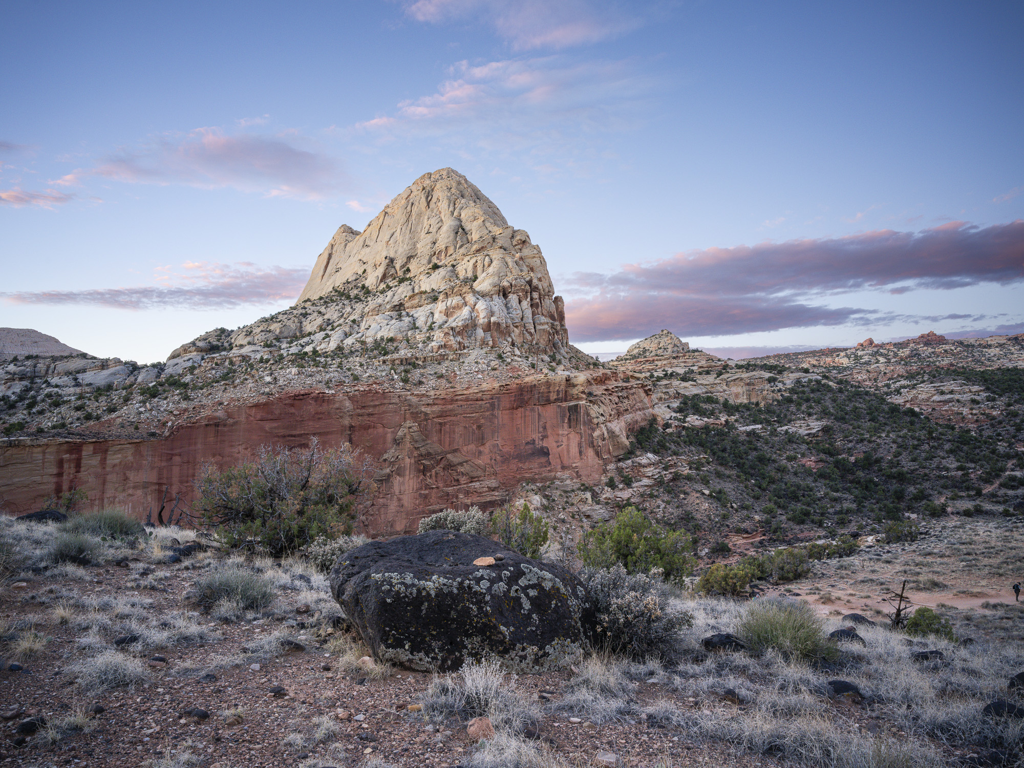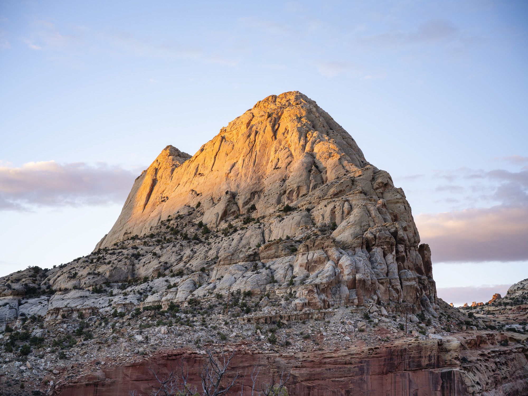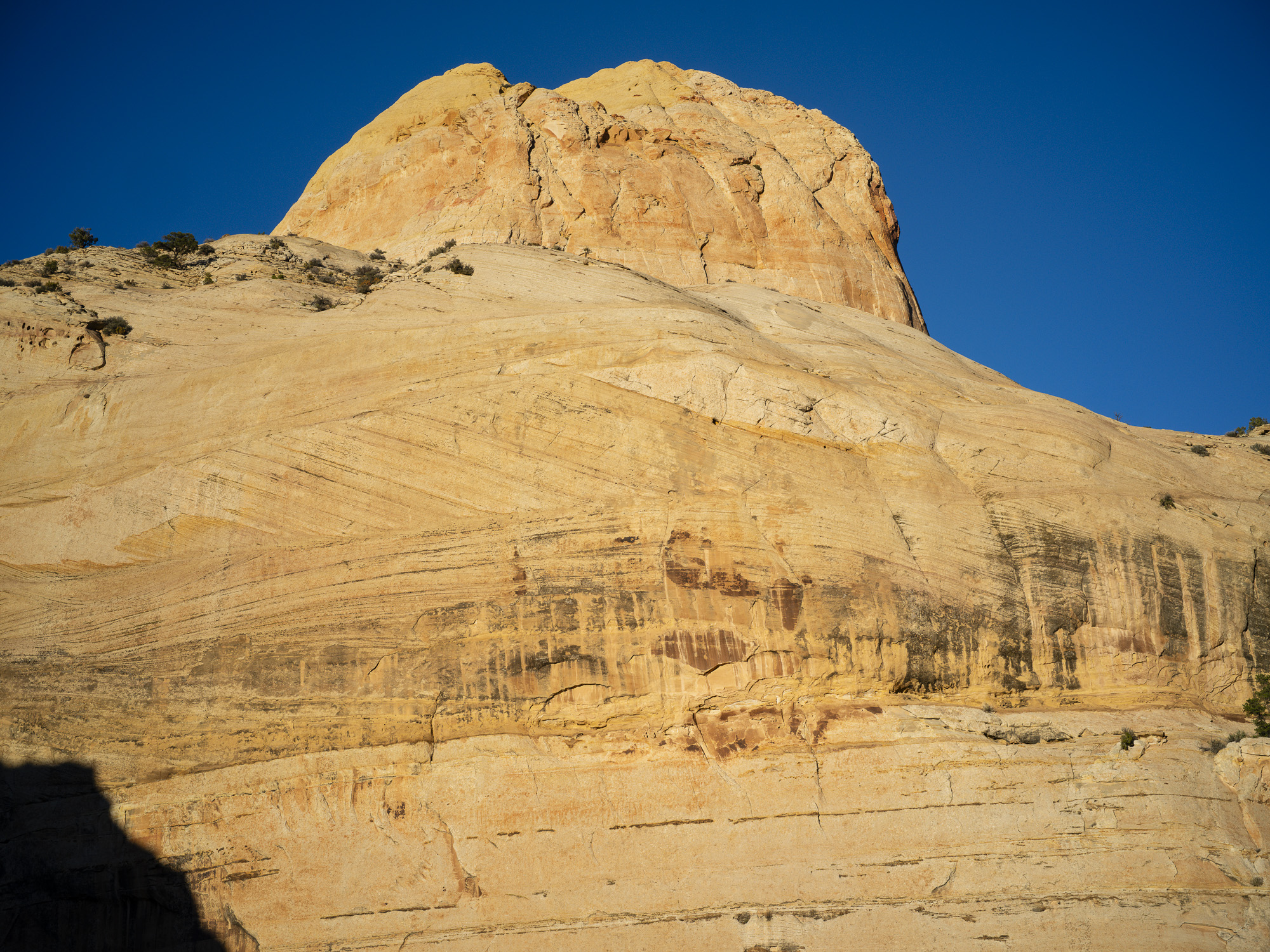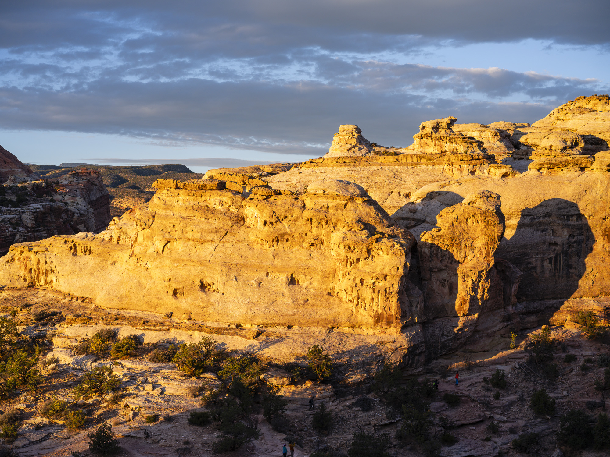As I drove toward Capitol Reef, I marveled at the trees along the Fremont River which were a brilliant yellow. I wandered down one road and got some nice photos of the trees contrasted with the chalky buttes behind them. I finally arrived at Capitol Reef, and took some nice sunset photos. The color in the rocks really glowed about 10 minutes before sunset. The next day, I hiked the Rim Overlook trail and was treated to a beautiful sunrise over Pectol’s Pyramid. I saw the sun light up the Hickman Bridge just underneath me. I turned around at the 2.3 mile mark but could have gone on to the Navajo Knobs another 2.2 miles further down the trail. Even so, the view from the turnaround was great. Unfortunately, clouds were pouring in quickly so I headed down just in time.