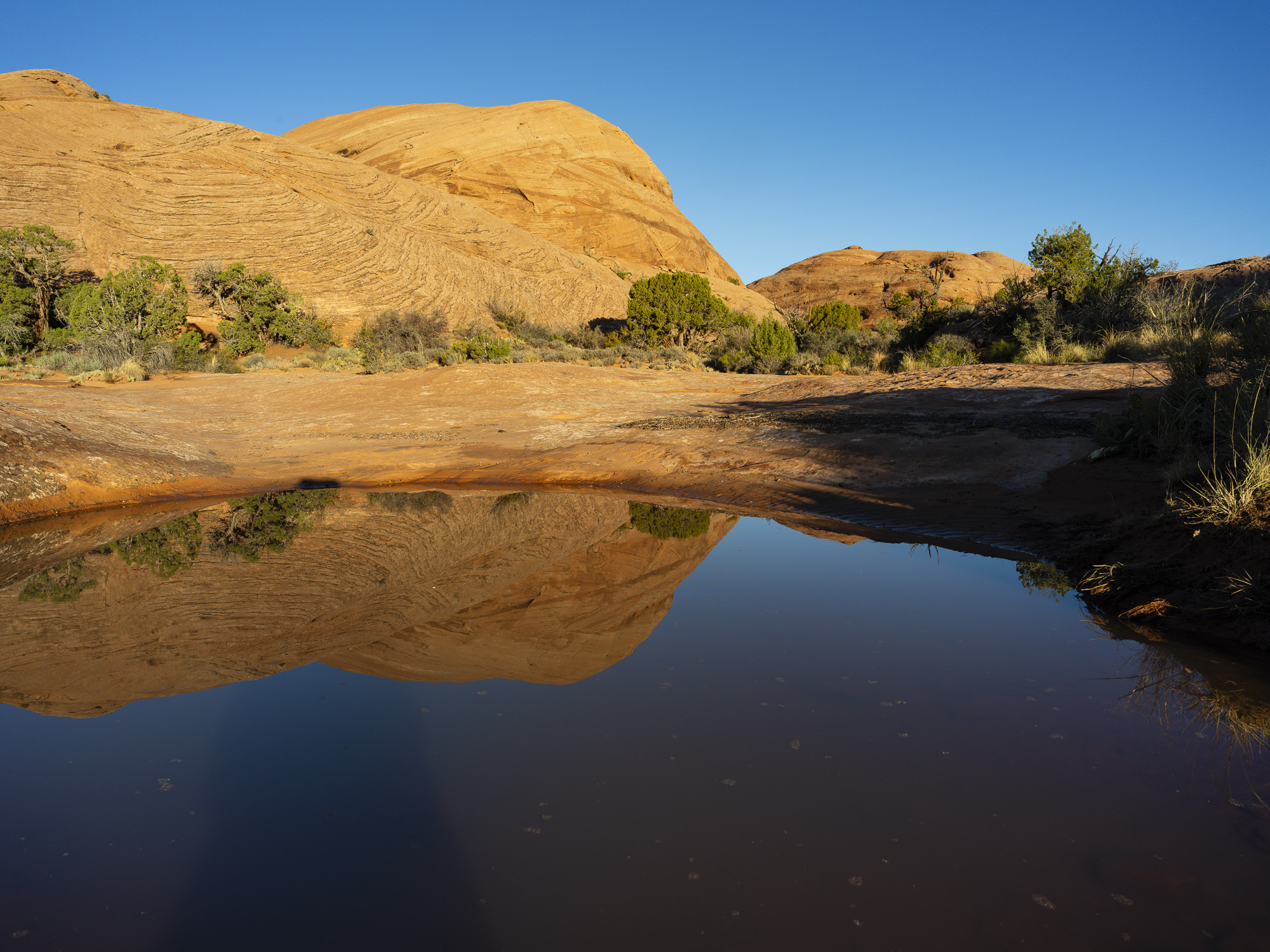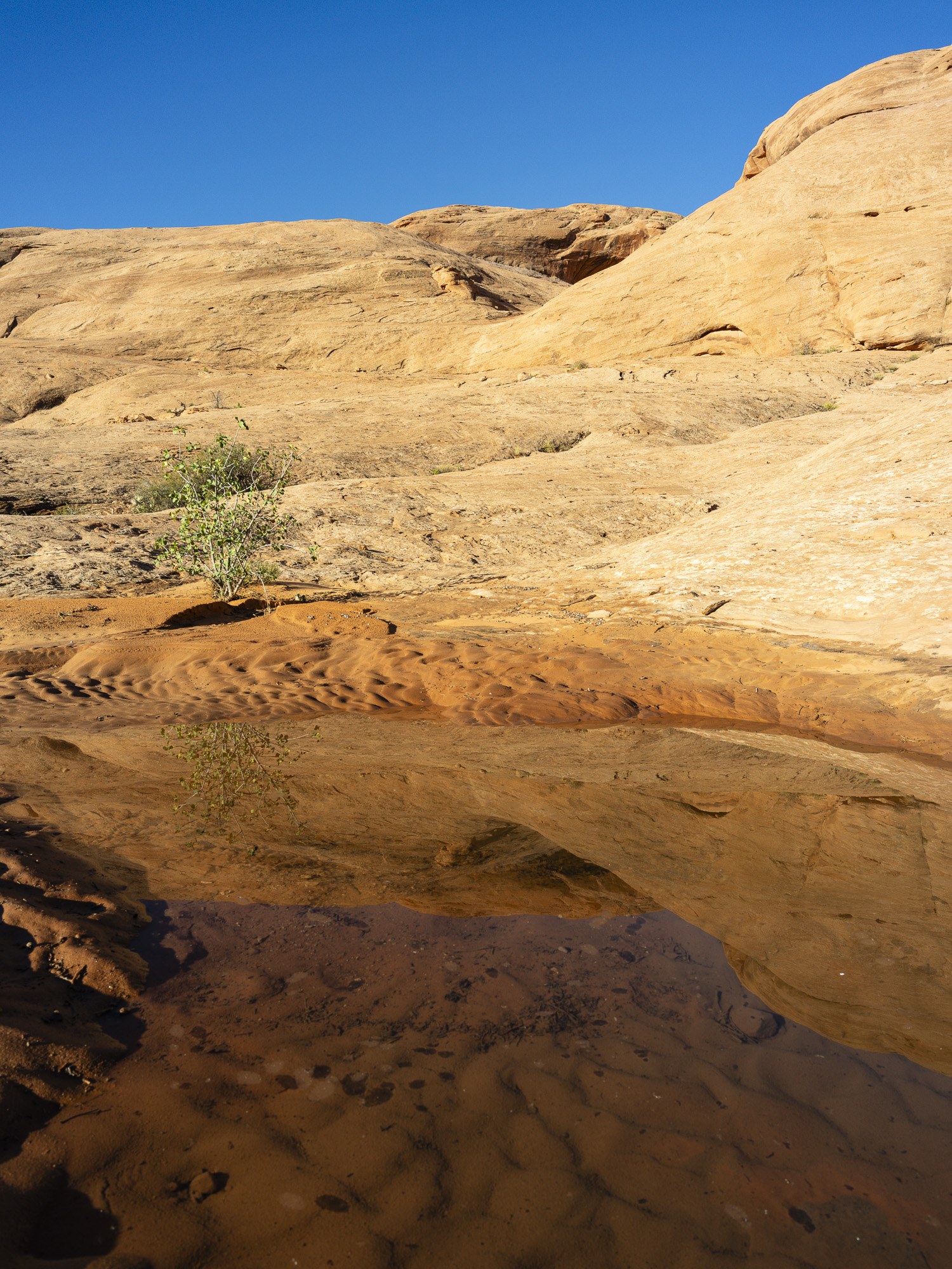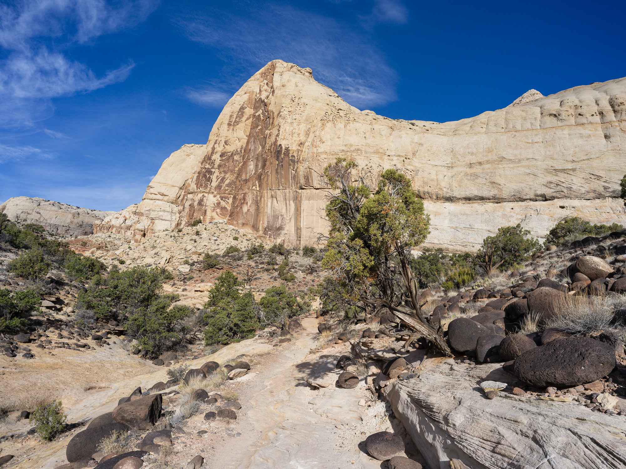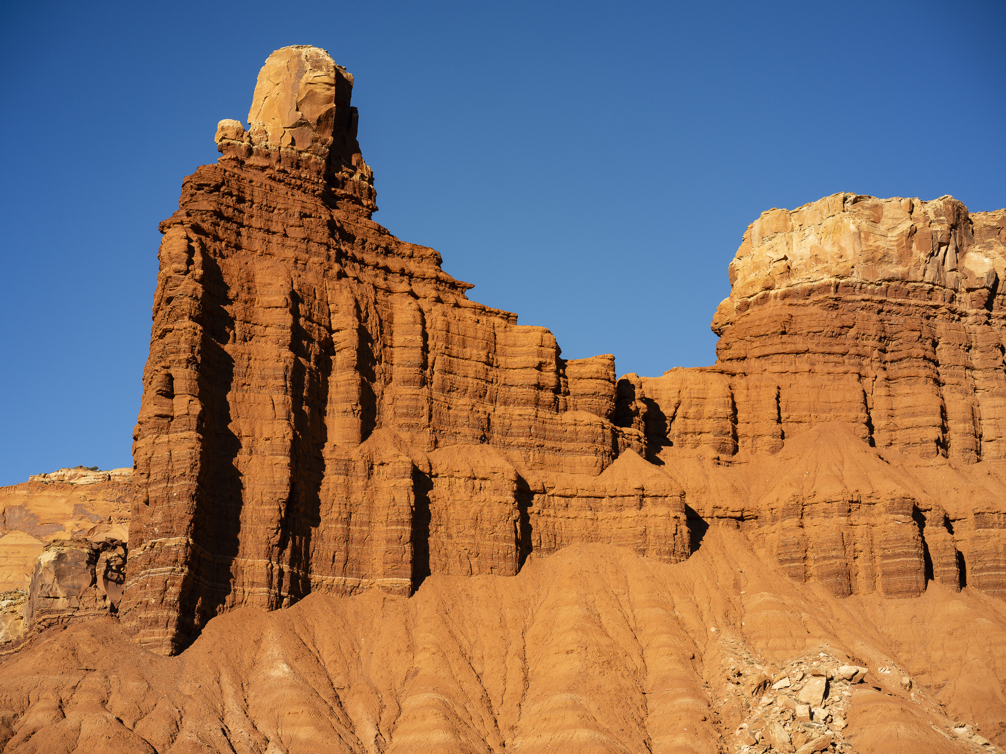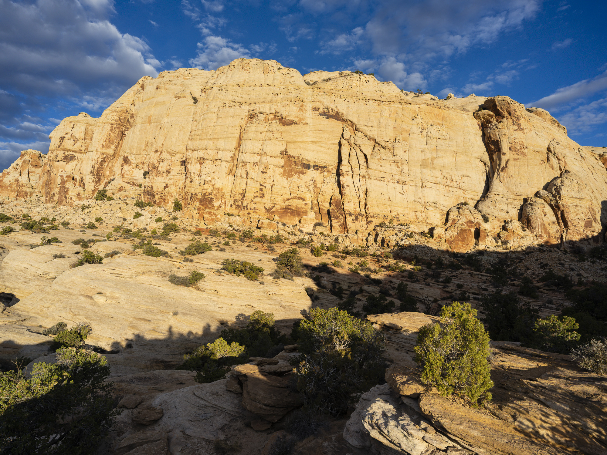 As I drove toward Capitol Reef, I marveled at the trees along the Fremont River which were a brilliant yellow. I wandered down one road and got some nice photos of the trees contrasted with the chalky buttes behind them. I finally arrived at Capitol Reef, and took some nice sunset photos. The color in the rocks really glowed about 10 minutes before sunset. The next day, I hiked the Rim Overlook trail and was treated to a beautiful sunrise over Pectol’s Pyramid. I saw the sun light up the Hickman Bridge just underneath me. I turned around at the 2.3 mile mark but could have gone on to the Navajo Knobs another 2.2 miles further down the trail. Even so, the view from the turnaround was great. Unfortunately, clouds were pouring in quickly so I headed down just in time.