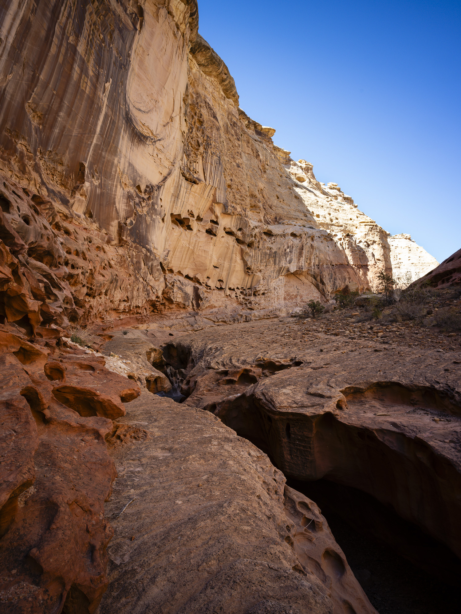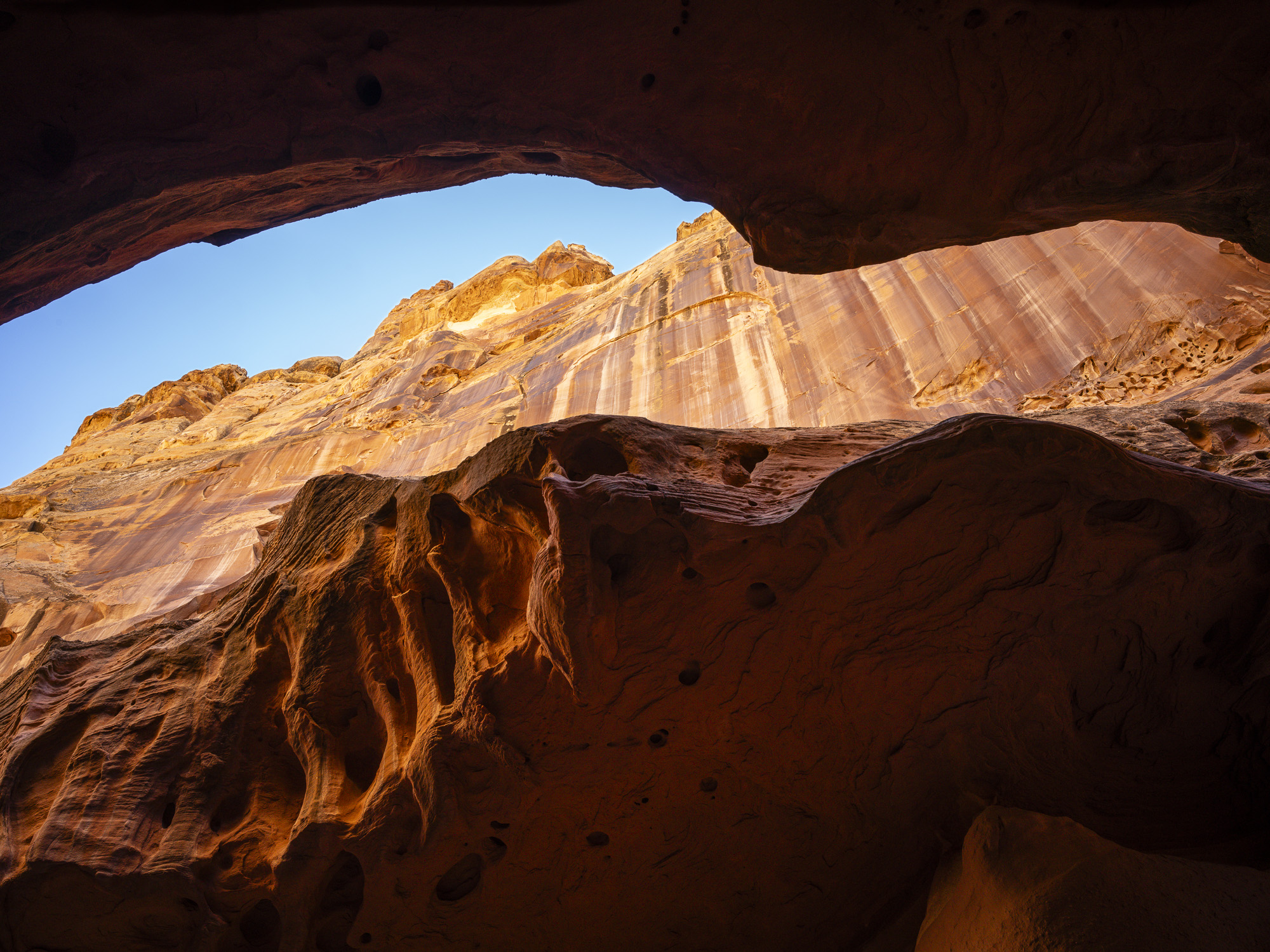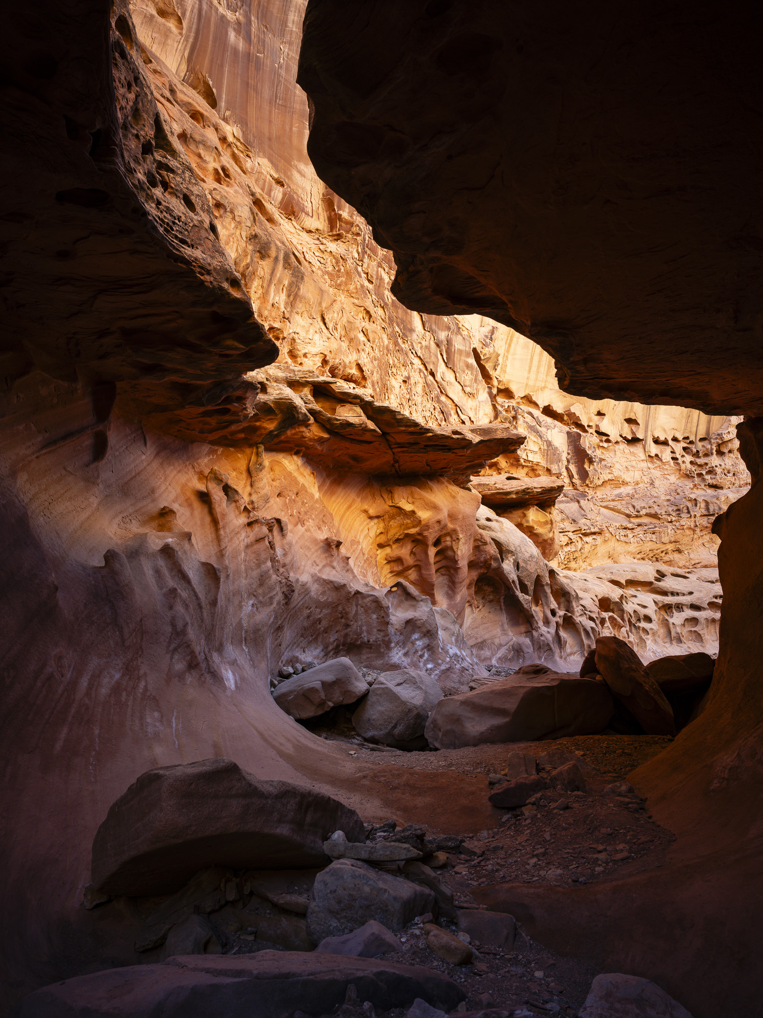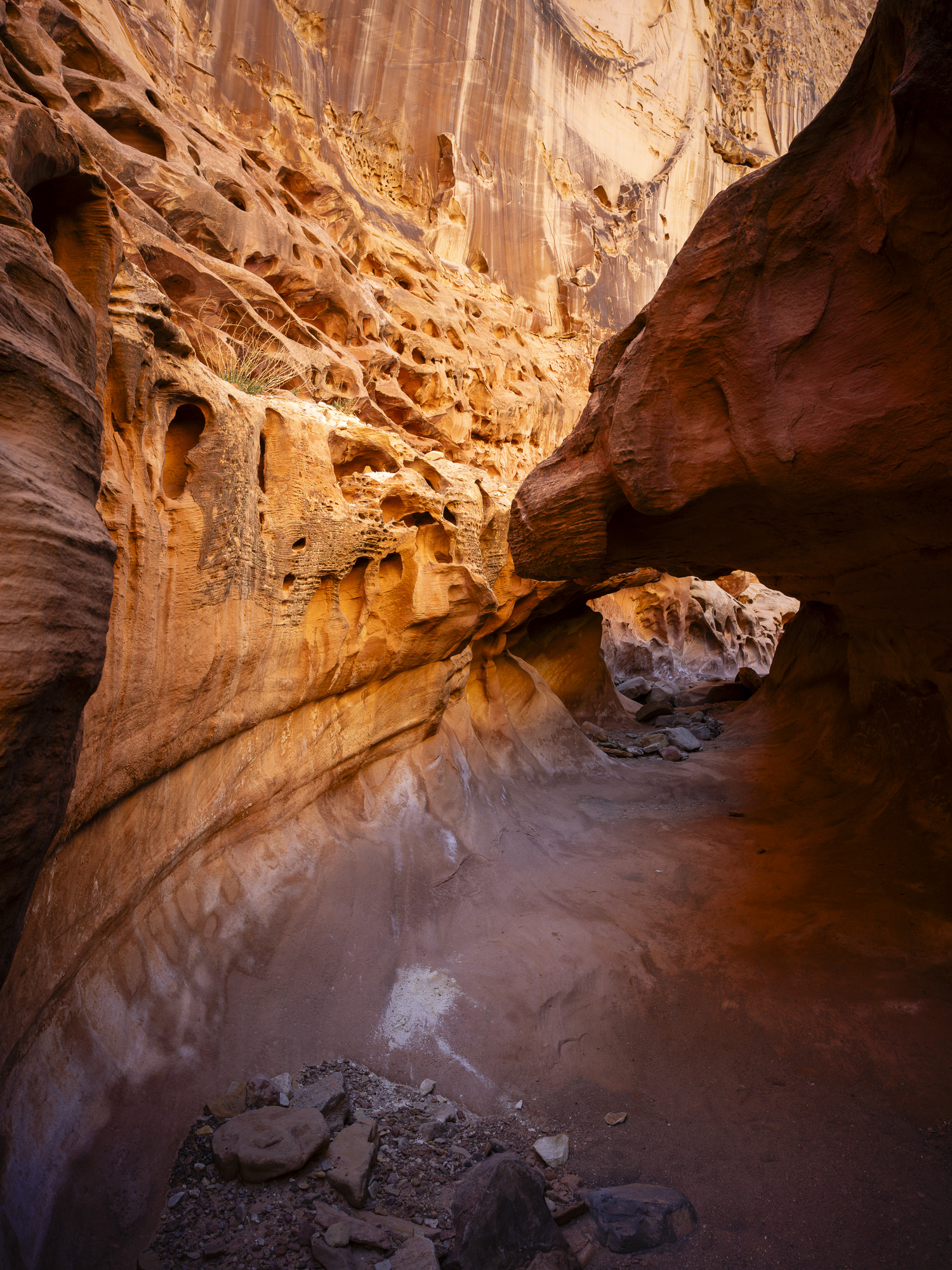In the afternoon, I made my way to Capitol Reef. I stopped at Crack Canyon for a quick hike. The Canyon is located on the back side of Goblin Valley State Park and the trailhead is accessed via a rough dirt rough. The Canyon features some amazing swiss cheese rock in its namesake narrows section. The walls converge here with just a crack of sunlight appearing above. The walls are a beautiful orange/brown color in this section. I had my camera stolen out of my car the last time I came here in 2020, so it was good to reclaim some memories without incident.