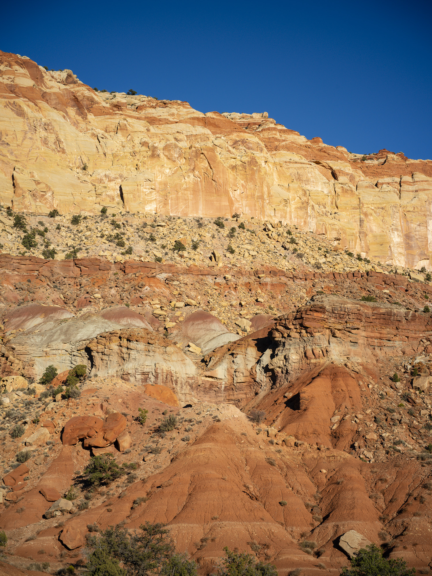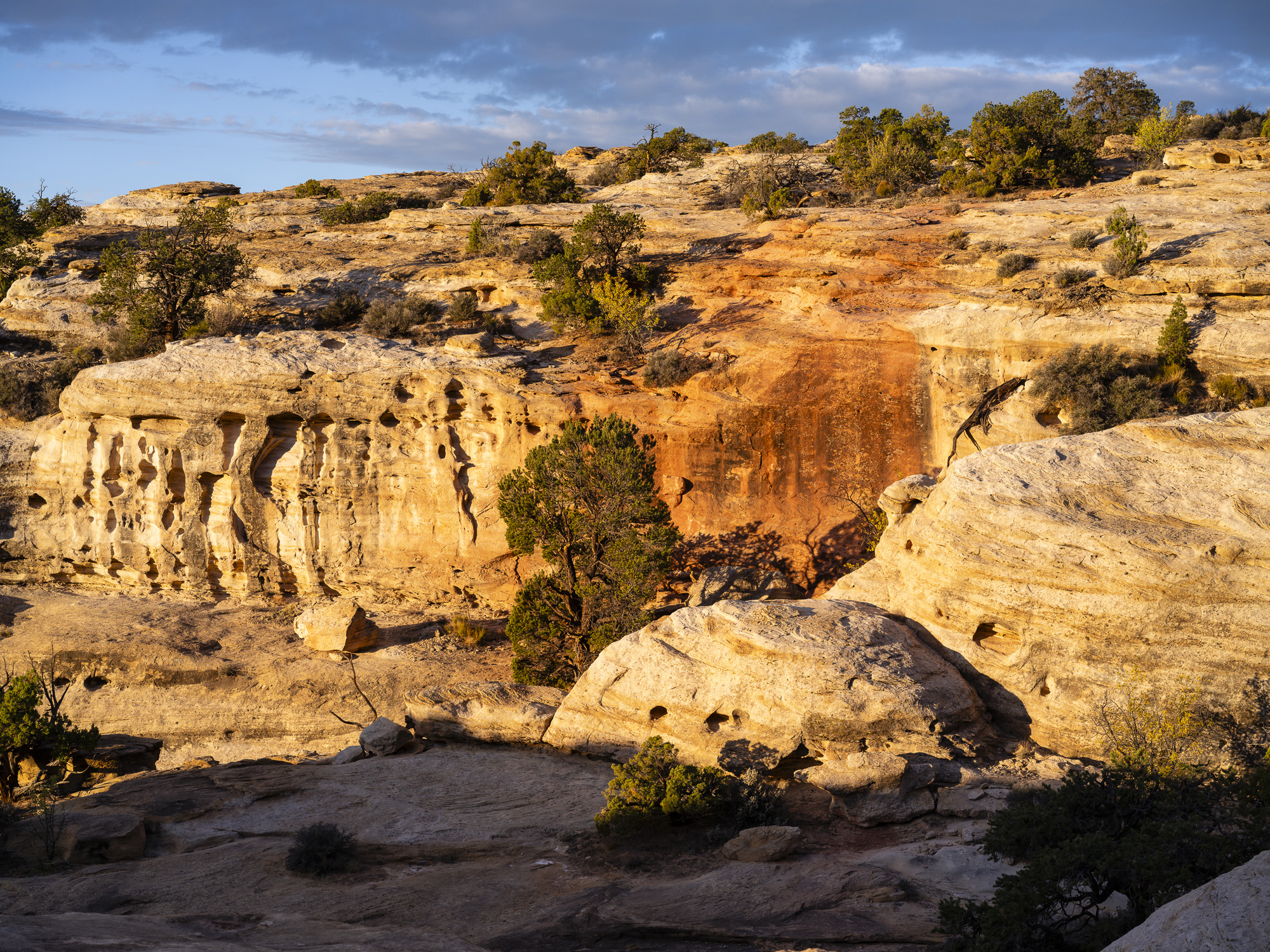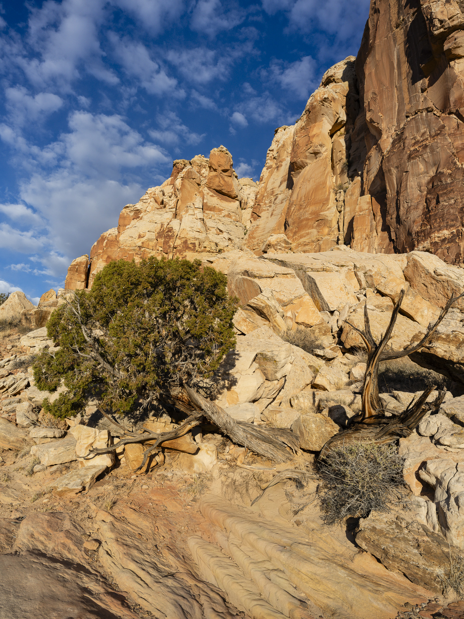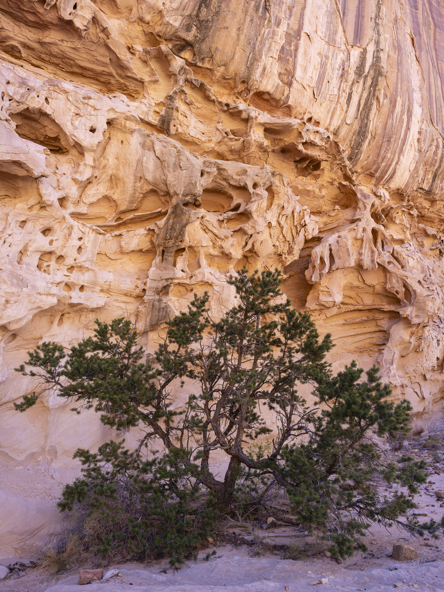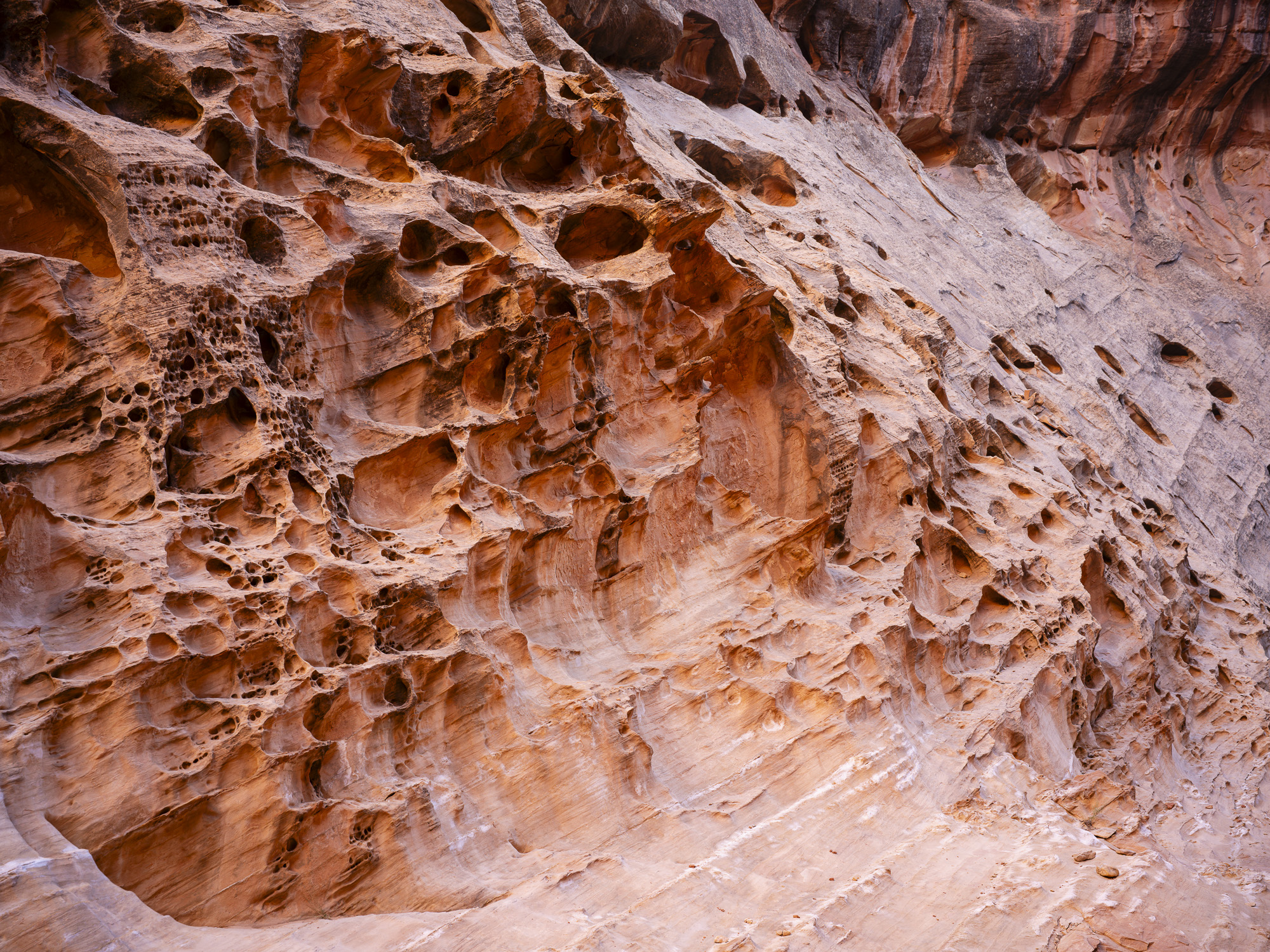 In the afternoon, I made my way to Capitol Reef. I stopped at Crack Canyon for a quick hike. The Canyon is located on the back side of Goblin Valley State Park and the trailhead is accessed via a rough dirt rough. The Canyon features some amazing swiss cheese rock in its namesake narrows section. The walls converge here with just a crack of sunlight appearing above. The walls are a beautiful orange/brown color in this section. I had my camera stolen out of my car the last time I came here in 2020, so it was good to reclaim some memories without incident.