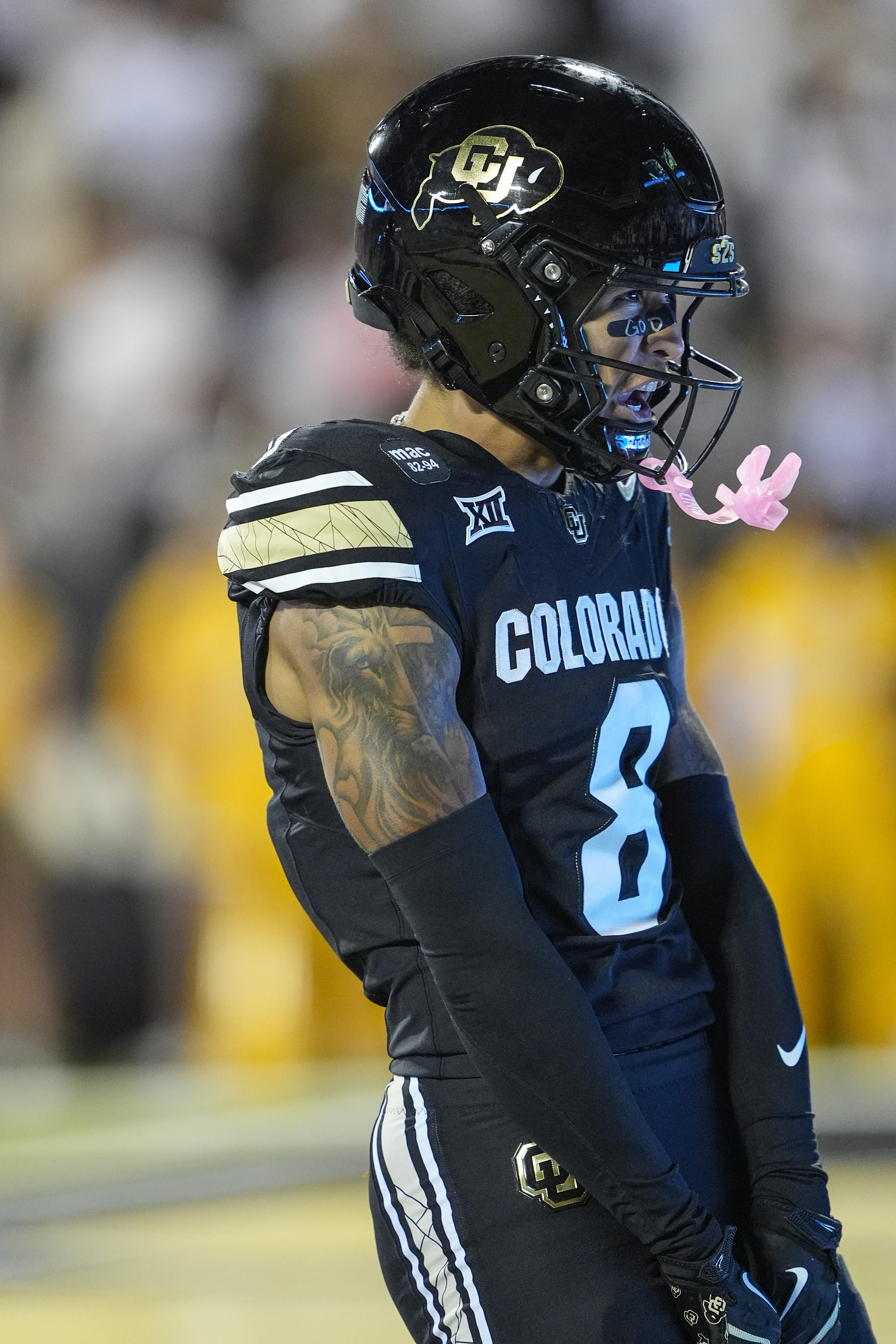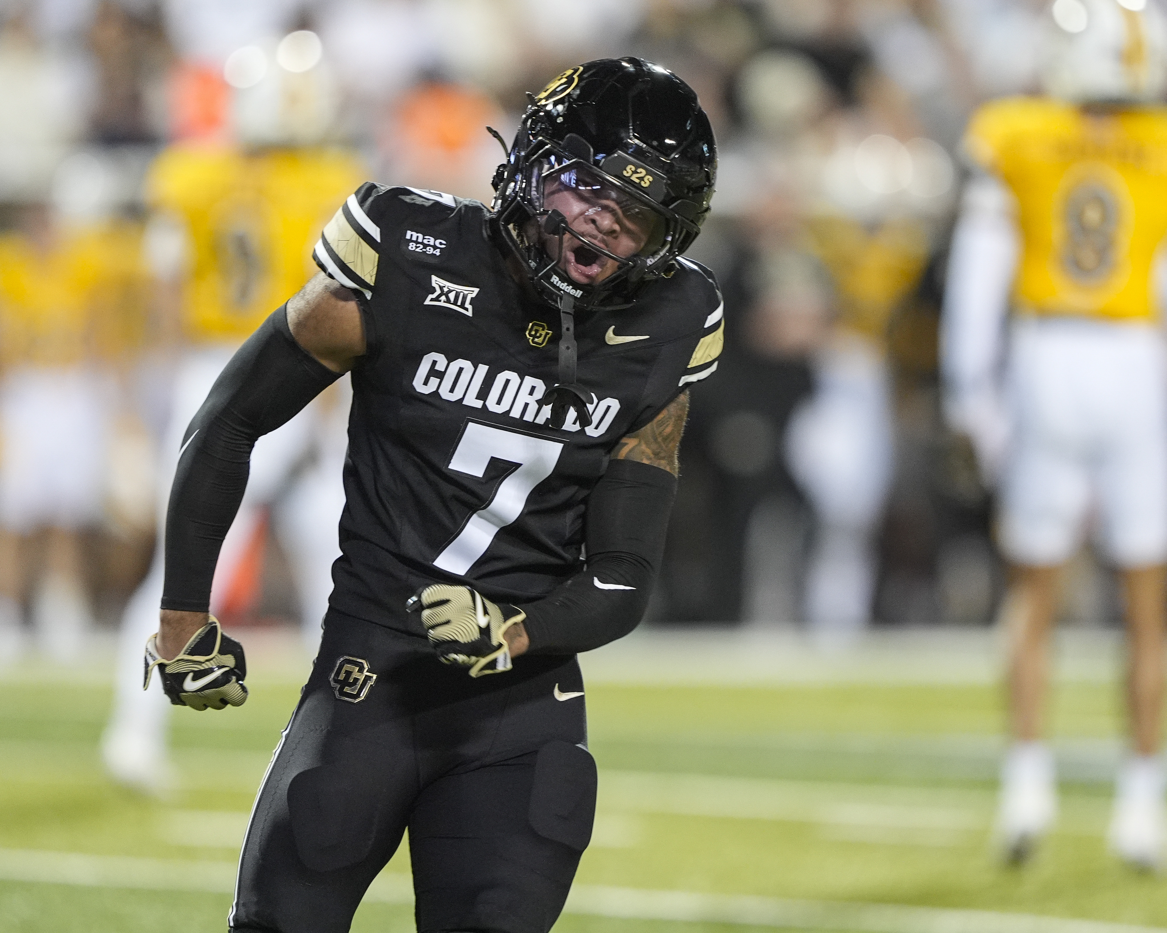 September 20, 2025: Colorado Buffaloes safety Tawfiq Byard (7) celebrates a big stop in the first half of the football game between Colorado and Wyoming in Boulder, CO. Derek Regensburger/CSM.