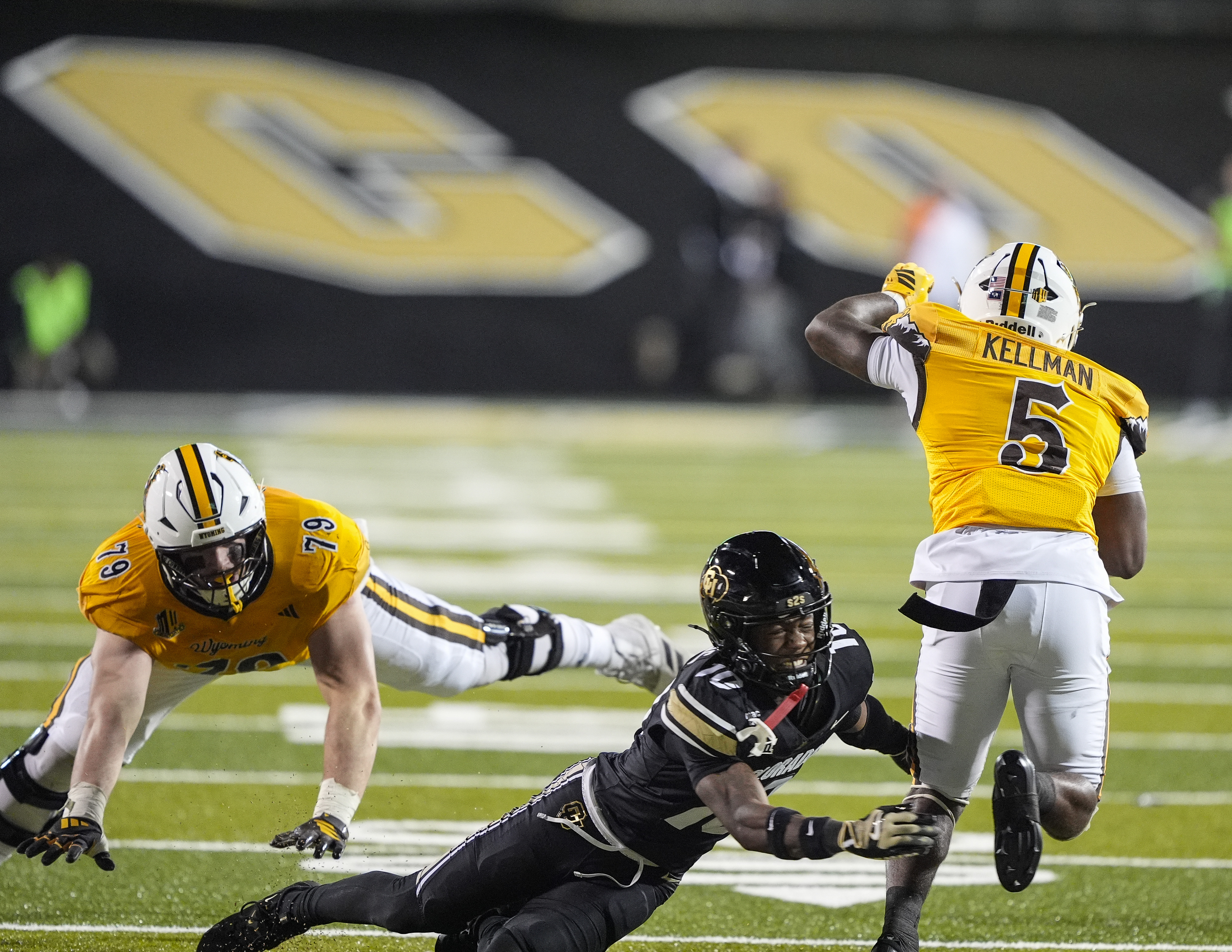 September 20, 2025: Colorado Buffaloes cornerback Makari Vickers (10) misses the tackle of Wyoming Cowboys running back Terron Kellman (5) as Wyoming Cowboys center Jack Walsh (79) flies by in the second half of the football game between Colorado and Wyoming in Boulder, CO. Derek Regensburger/CSM.