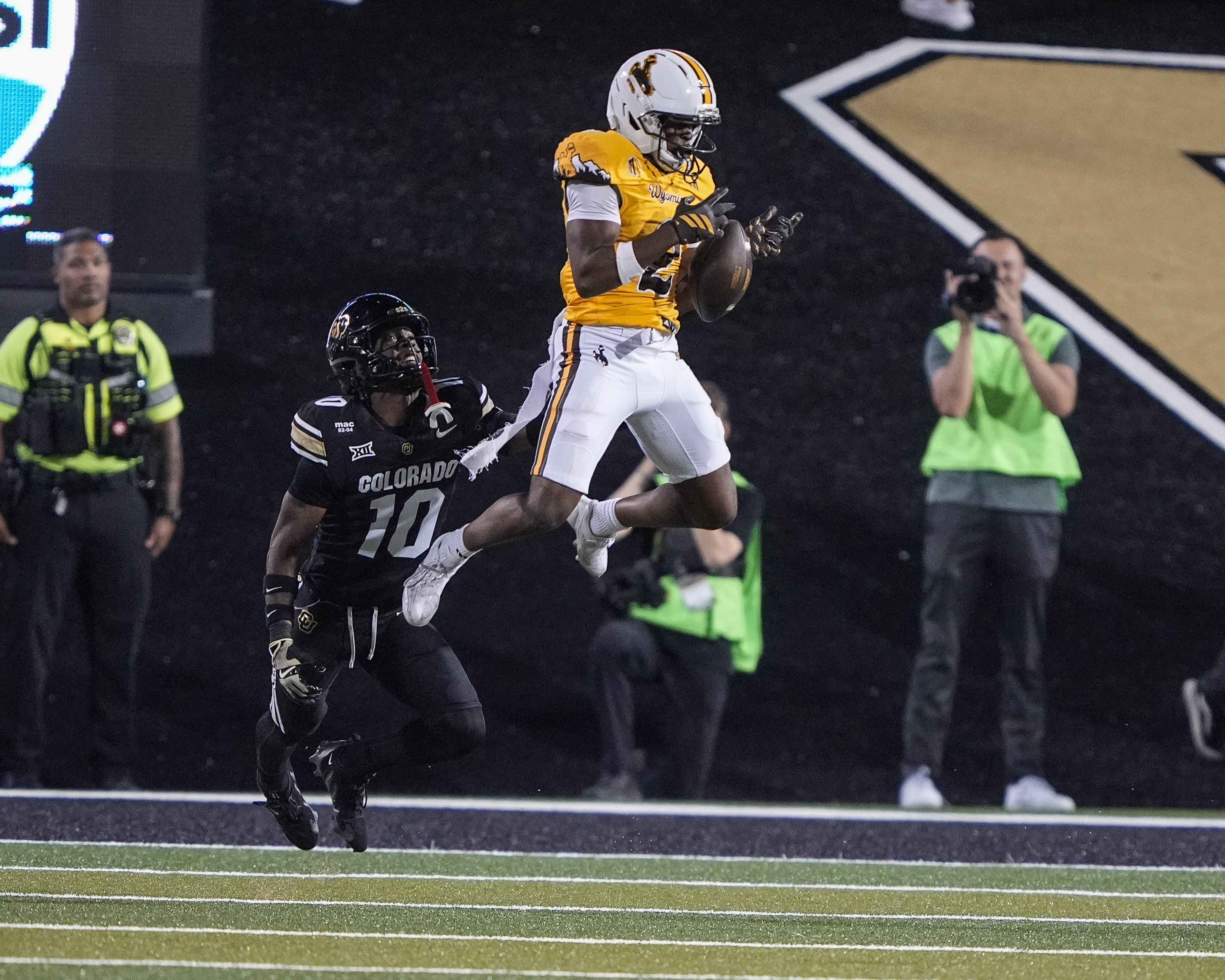 September 20, 2025: Wyoming Cowboys wide receiver Eric Richardson (2) drops the ball as he goes up for a pass against Colorado Buffaloes cornerback Makari Vickers (10) in the second half of the football game between Colorado and Wyoming in Boulder, CO. Derek Regensburger/CSM.