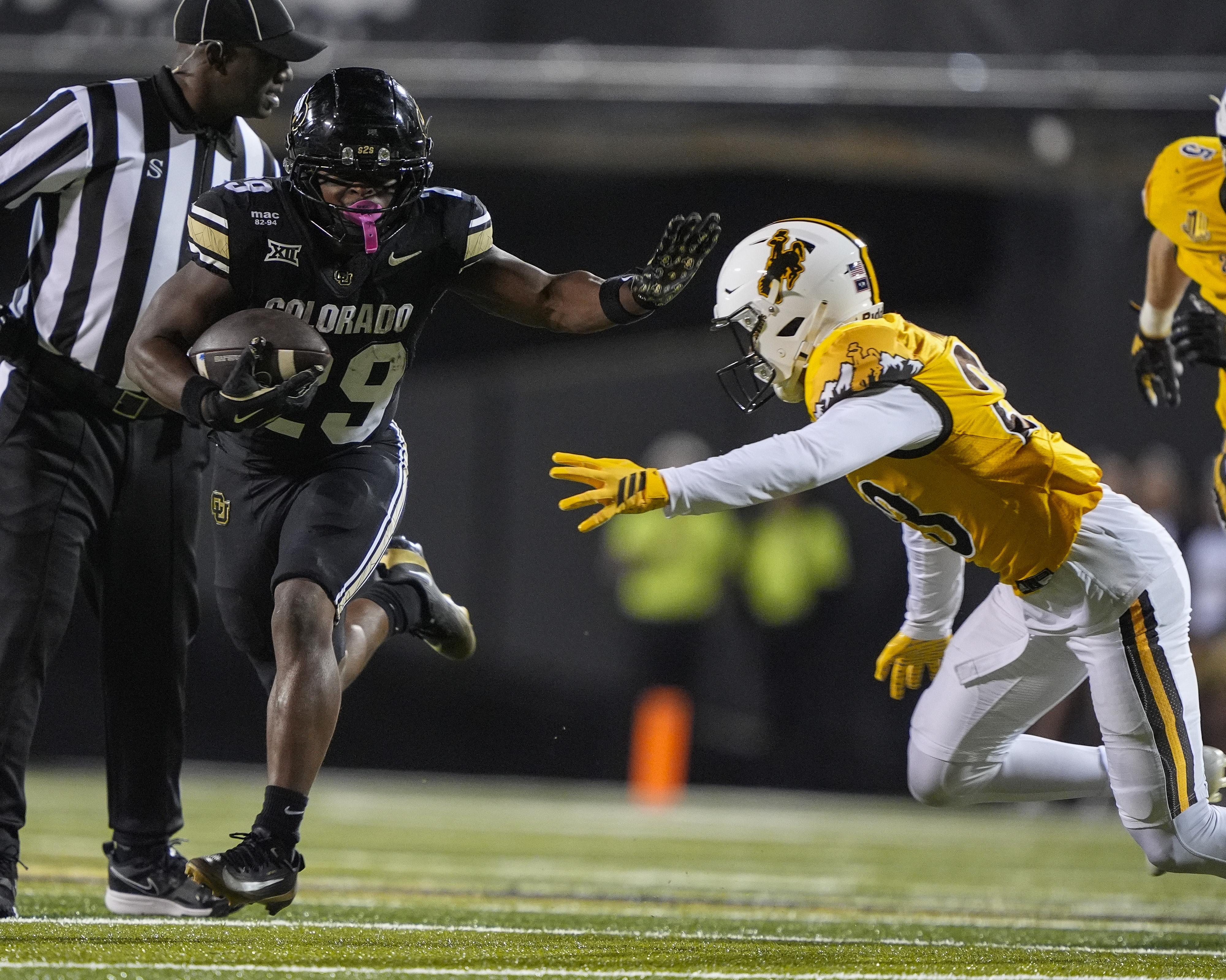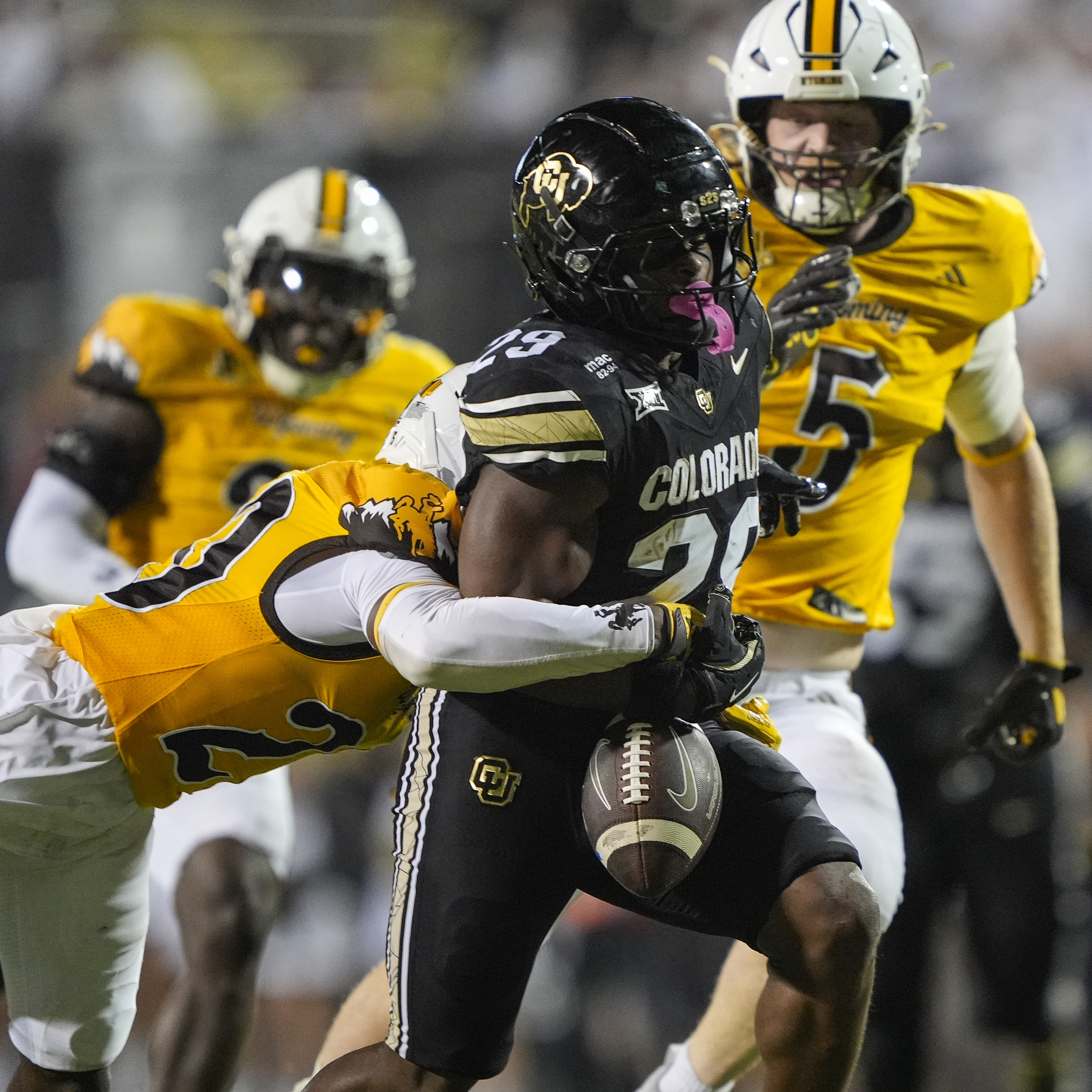 September 20, 2025: Colorado Buffaloes running back Micah Welch (29) avoids the tackle of Wyoming Cowboys safety Jones Thomas (23) in the second half of the football game between Colorado and Wyoming in Boulder, CO. Derek Regensburger/CSM.