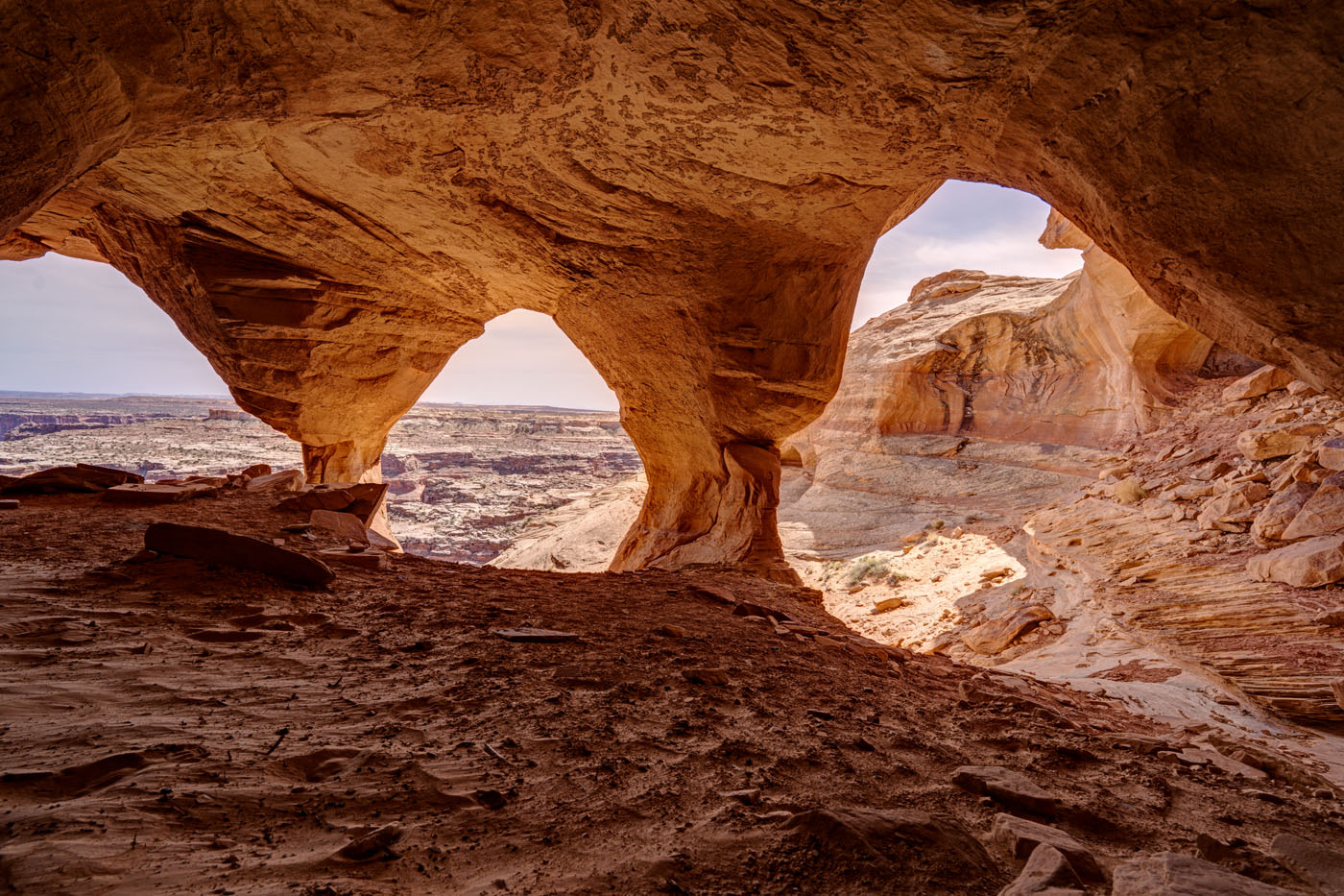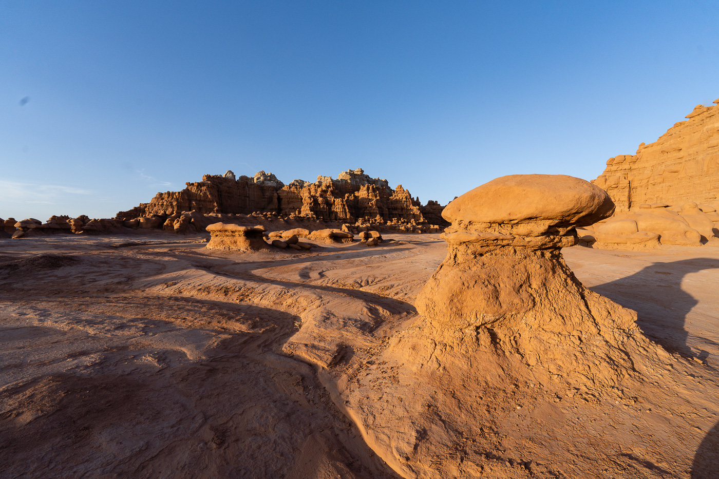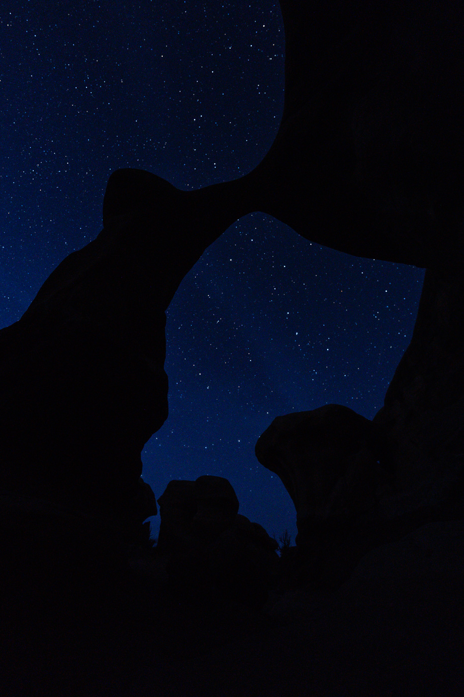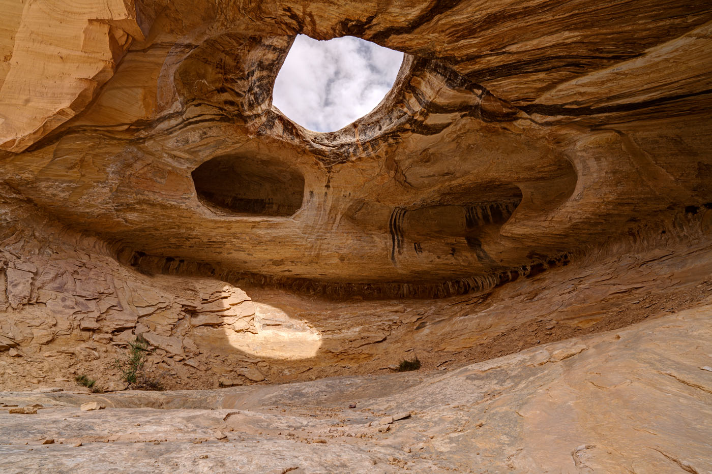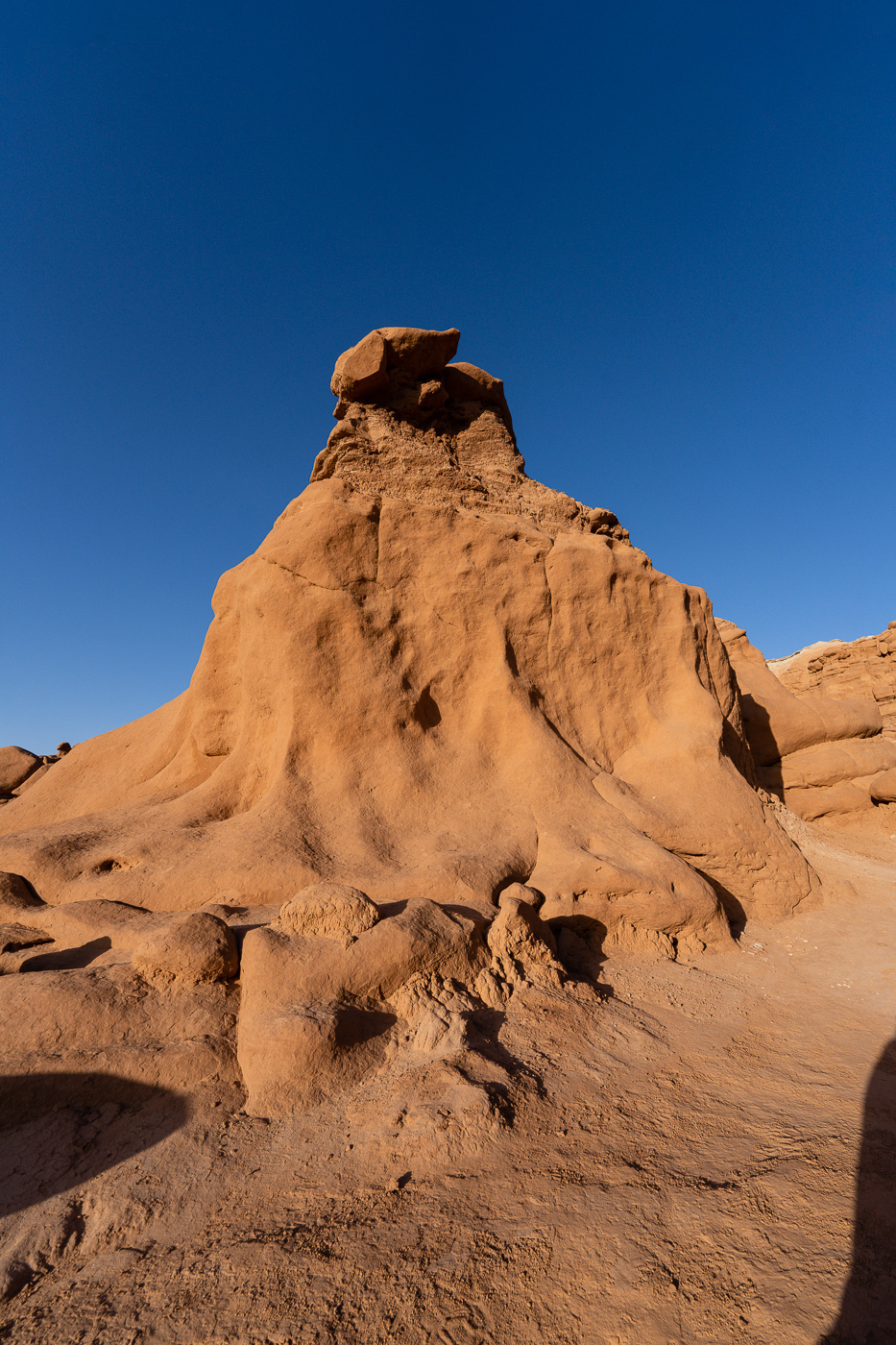 I also stopped at the trail to Wild Horse Window. This is a challenging 1 mile hike. Located off the park road just past the junction with Temple Mountain Road, the trailhead for this hike is located at the end of a short dirt road. To get there, turn left onto to the Goblin Valley Road at the junction with the Temple Mountain Road. Go about .3 mile and turn down the short dirt road to your right. The hike then leads down a short trail into and out of the wash below. The trail then proceeds north, steeply up slickrock. There is no real trail from here. You just aim for what looks like a large cave directly to your north. Unfortunately, as you hike you lose sight of the cave pretty quickly. The route requires you to stay to your right to avoid the large canyon to your left. Then, you must veer a little more right to avoid a large rock outcropping to your left. If you find yourself in a sort of mini canyon with rock faces to either side, you’re in the right place. You will then cross a sandy area that again leads steeply upward. Hug the left wall here and you should be fine. You then pop out in the area where the Window arch is located. The arch looks from the outside like a pair of eyeglasses. It has a large pothole type arch is back of the main entrance. This indeed is a cool little arch.