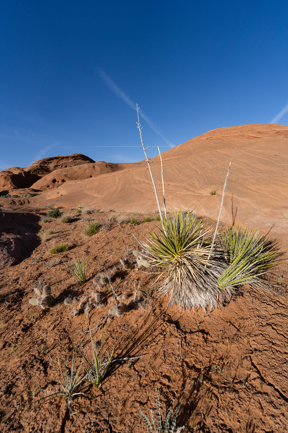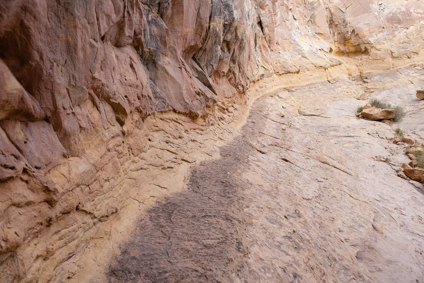 The alternate route has the virtue of being shorter but requires more navigation skills. The way is cairned in spots but the route can be difficult to find at times as well. After you veer right at the sign mentioned above, the route makes it way over a rocky area before ascending a large rock face. It then descends the face and veers sharply to the left. It then makes another turn to the right to head down a large sand dune. You are aiming for Choprock, a large rock outcropping with dark vertical stripes in it that guards the entrance to Neon Canyon (you can see the rock from the trailhead but will soon lose it off and on as you walk). A word of caution. If you are going to take this route, take it down but don’t take it back up. I make this mistake and you will pay for it. You have to ascend a 300 foot section of sand dune and then climb another few hundred feet to ascend that large rock butte I mentioned above. I also missed the sharp turn to the left and found myself staring into the steep abyss of Fence Canyon. Eventually, I backtracked and found the route back to the main trail. I then faced the grim reality of ascending the five hundred feet of slickrock at the end after an already tiring return trip.