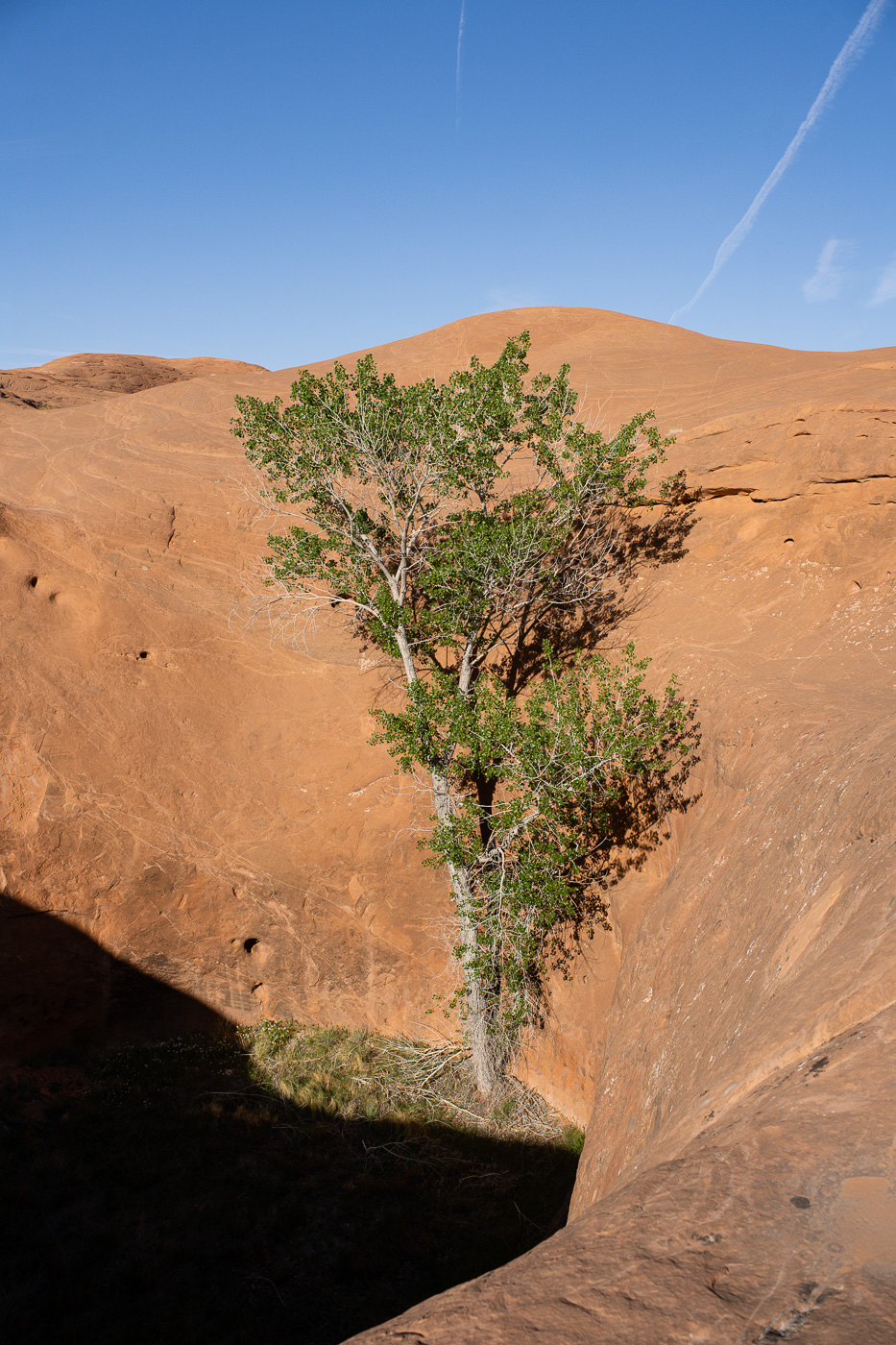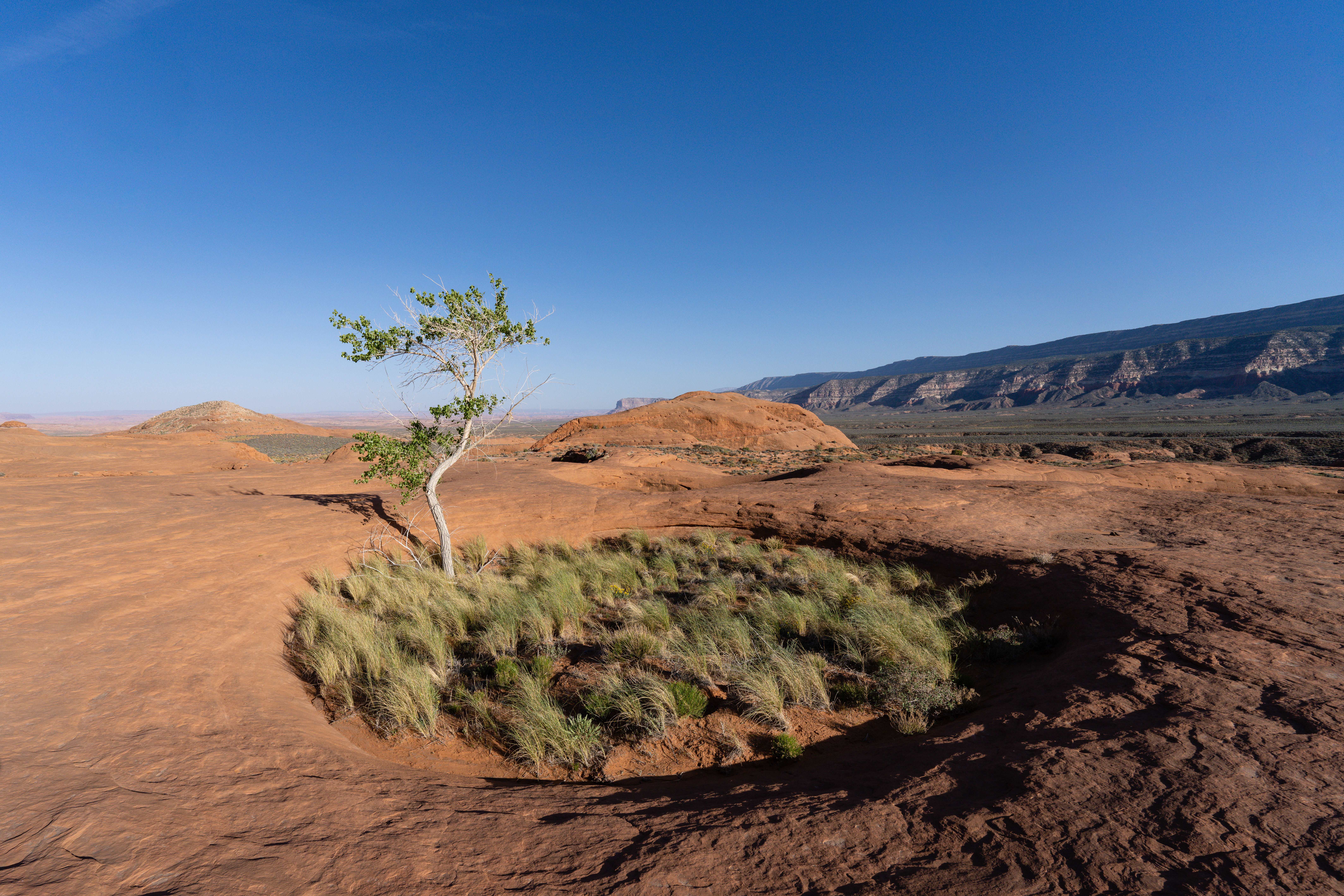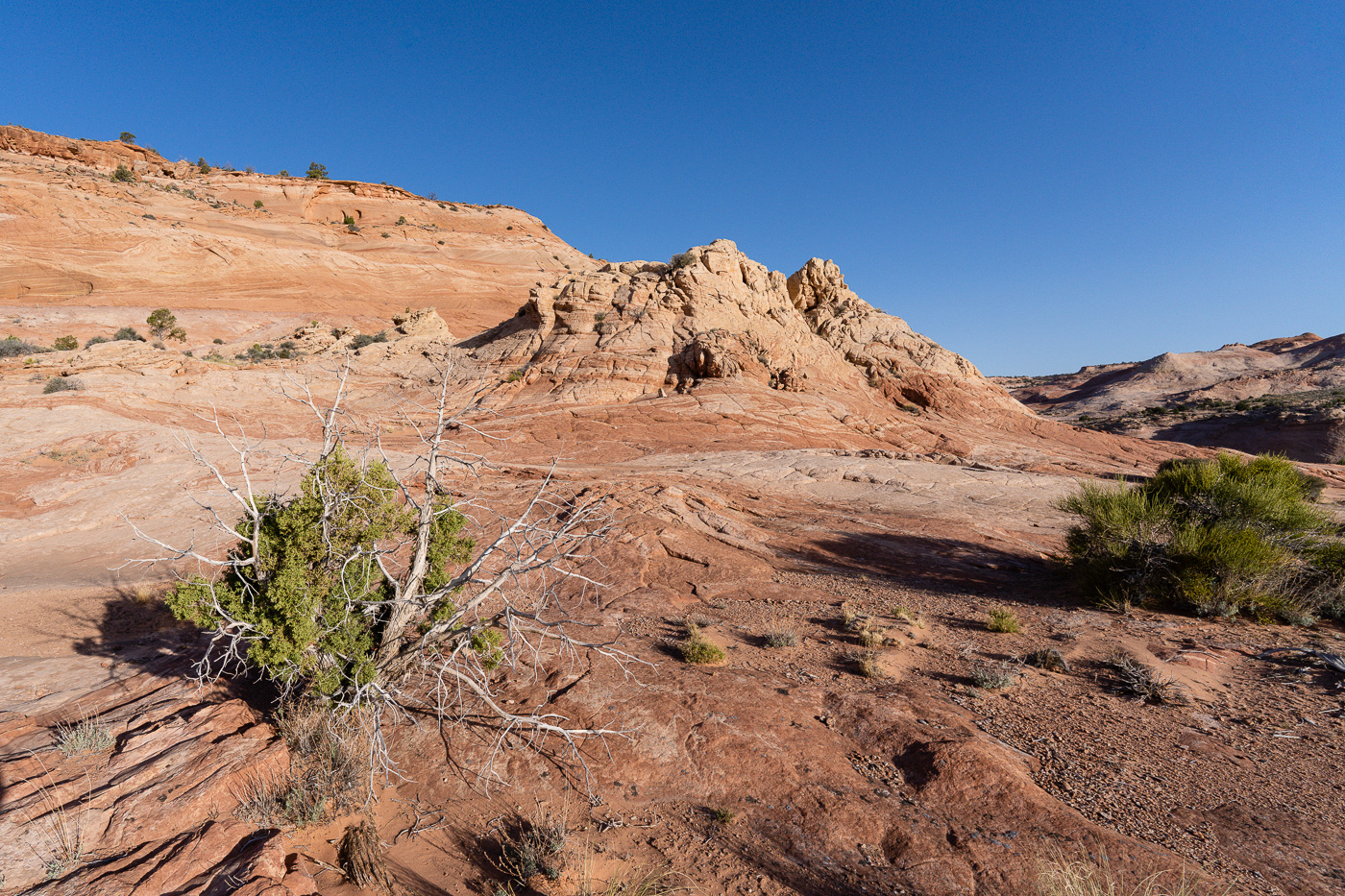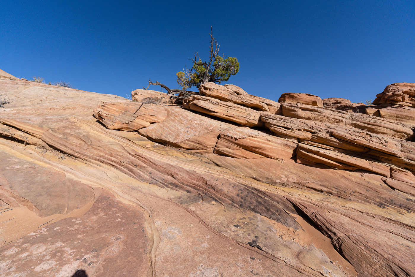 Located toward the end of Hole in the Rock Road (at mile 37) one finds Dance Hall Rock. It is a seemingly nondescript stop with a small parking area but don’t be fooled. The area is worth a visit. First, the name is misleading. It is not one rock but many large sandstone mounds, each about 50 feet high. Once on top of the rocks, things get interesting, The rocks contain potholes which can make for some really unique photography. Several have trees growing out of them. The problem of course is contrast. Unless you shoot the rocks at midday, the potholes will be encased in shadow. I liked shooting a couple of hours before sunset, so the rocks had a nice glow to them but shadows weren’t too bad yet. Be prepared for more than a short walk as well. The mounds extend for about a mile. I also found staring down into large potholes while on top of a 50 foot tall rock to be disorienting. Hopefully, the winds will be calmer than when I was there.