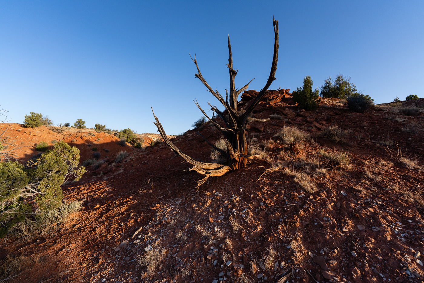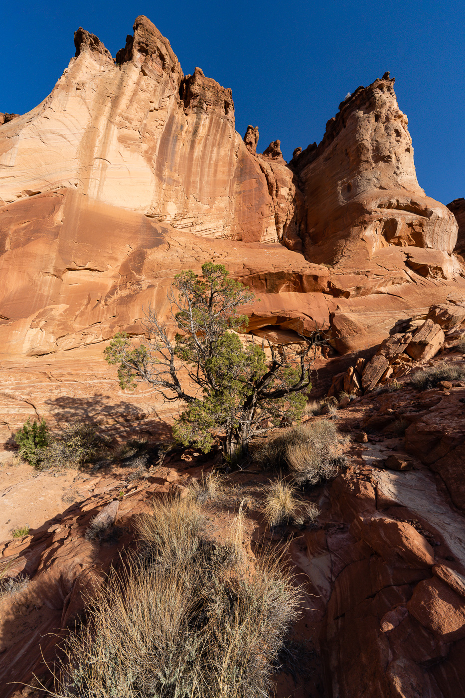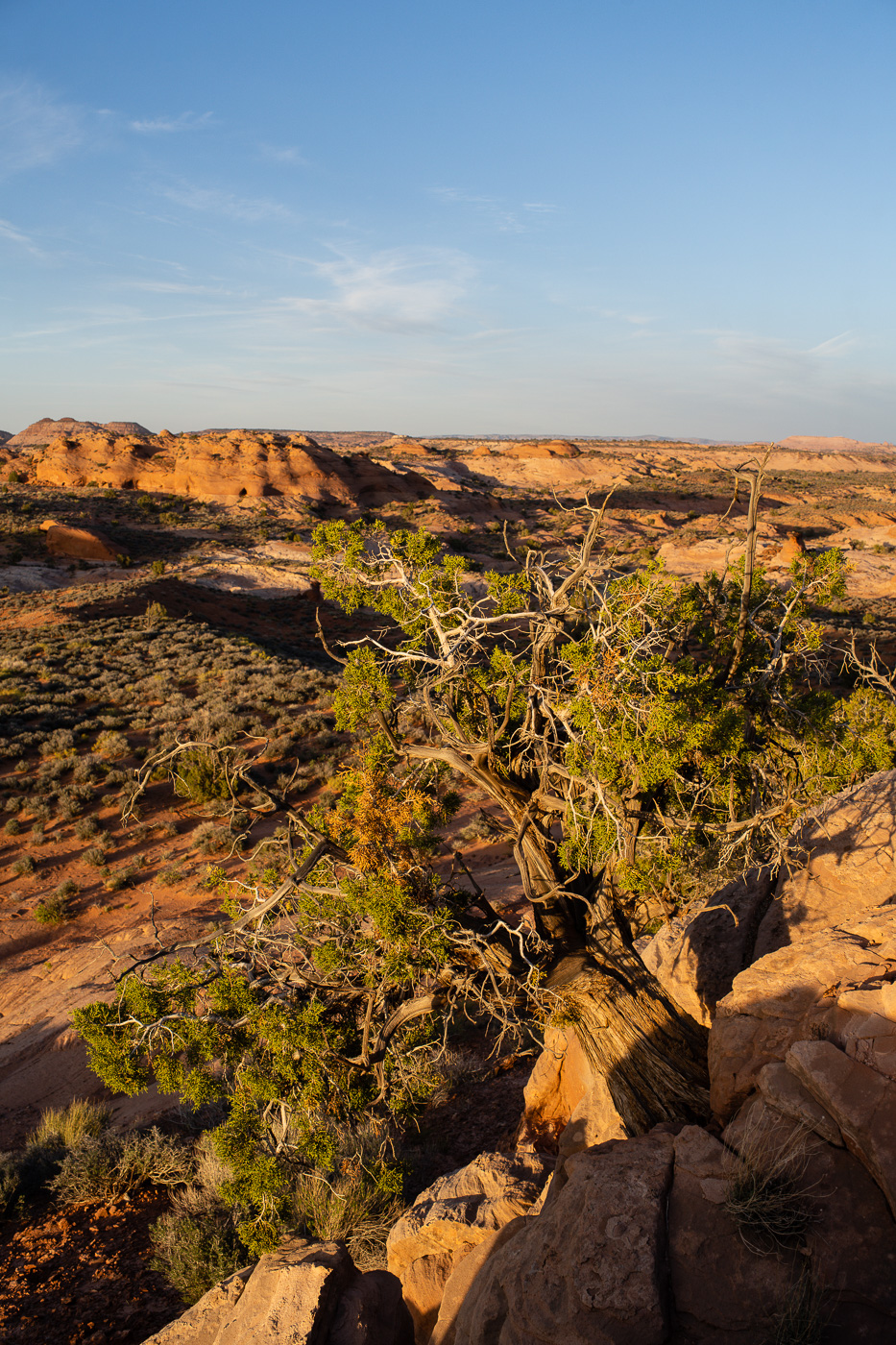 Located toward the end of Hole in the Rock Road (at mile 37) one finds Dance Hall Rock. It is a seemingly nondescript stop with a small parking area but don’t be fooled. The area is worth a visit. First, the name is misleading. It is not one rock but many large sandstone mounds, each about 50 feet high. Once on top of the rocks, things get interesting, The rocks contain potholes which can make for some really unique photography. Several have trees growing out of them. The problem of course is contrast. Unless you shoot the rocks at midday, the potholes will be encased in shadow. I liked shooting a couple of hours before sunset, so the rocks had a nice glow to them but shadows weren’t too bad yet. Be prepared for more than a short walk as well. The mounds extend for about a mile. I also found staring down into large potholes while on top of a 50 foot tall rock to be disorienting. Hopefully, the winds will be calmer than when I was there.