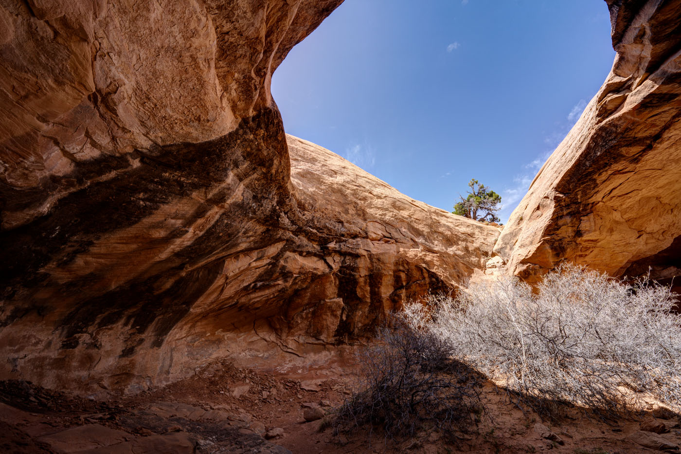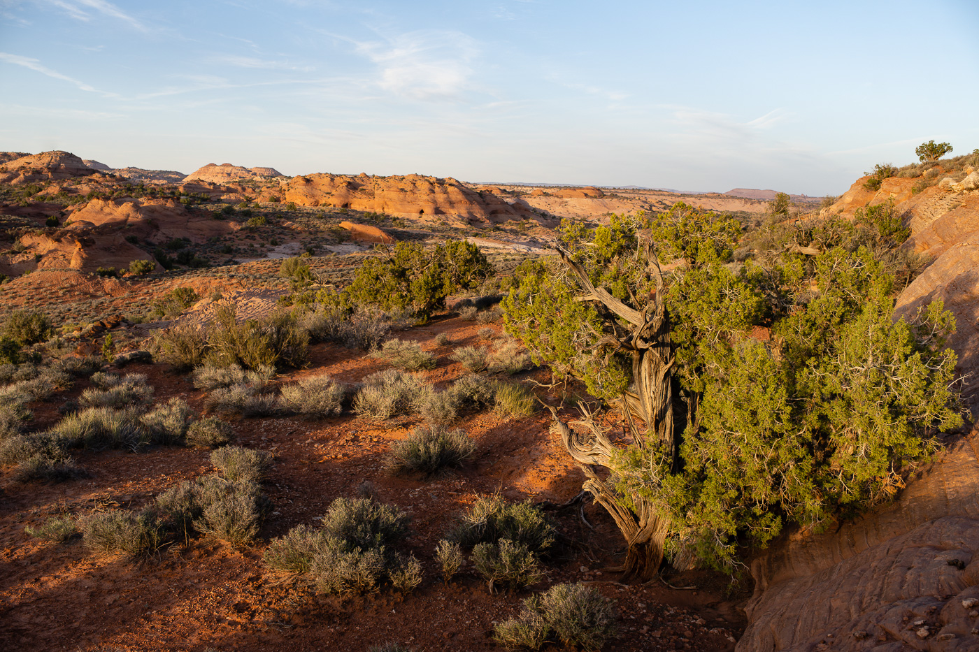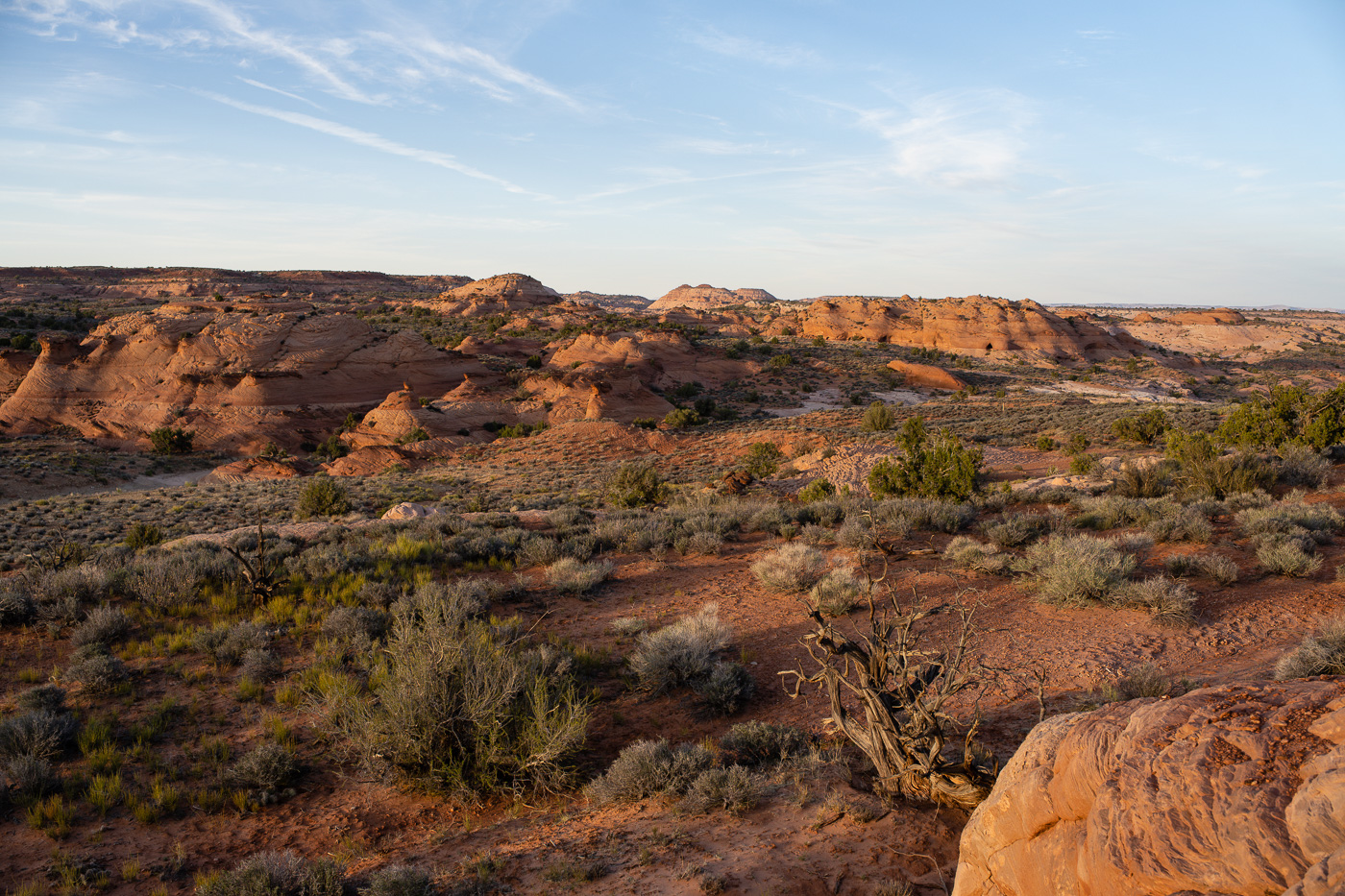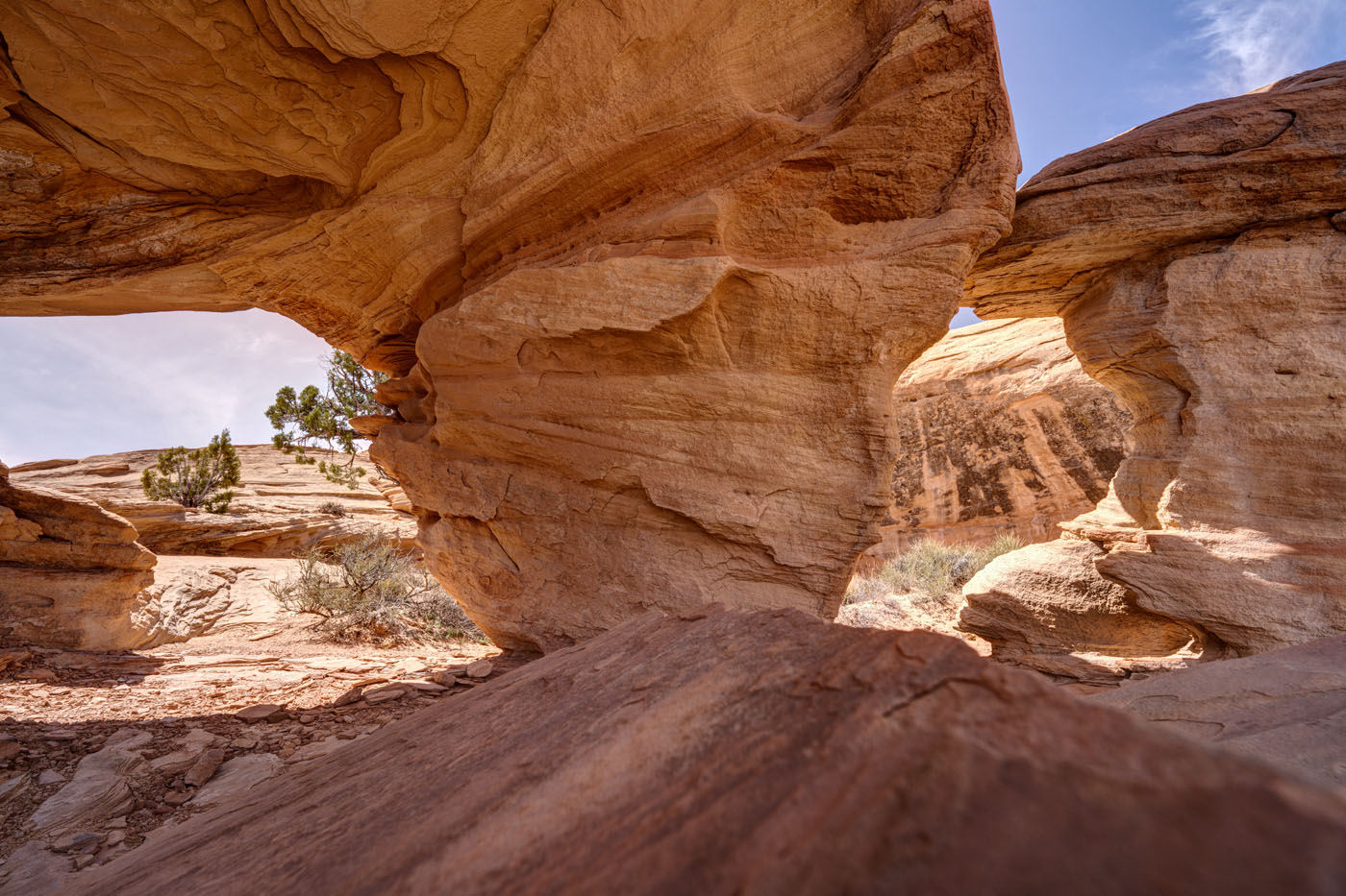 Located toward the end of Hole in the Rock Road (at mile 37) one finds Dance Hall Rock. It is a seemingly nondescript stop with a small parking area but don’t be fooled. The area is worth a visit. First, the name is misleading. It is not one rock but many large sandstone mounds, each about 50 feet high. Once on top of the rocks, things get interesting, The rocks contain potholes which can make for some really unique photography. Several have trees growing out of them. The problem of course is contrast. Unless you shoot the rocks at midday, the potholes will be encased in shadow. I liked shooting a couple of hours before sunset, so the rocks had a nice glow to them but shadows weren’t too bad yet. Be prepared for more than a short walk as well. The mounds extend for about a mile. I also found staring down into large potholes while on top of a 50 foot tall rock to be disorienting. Hopefully, the winds will be calmer than when I was there.