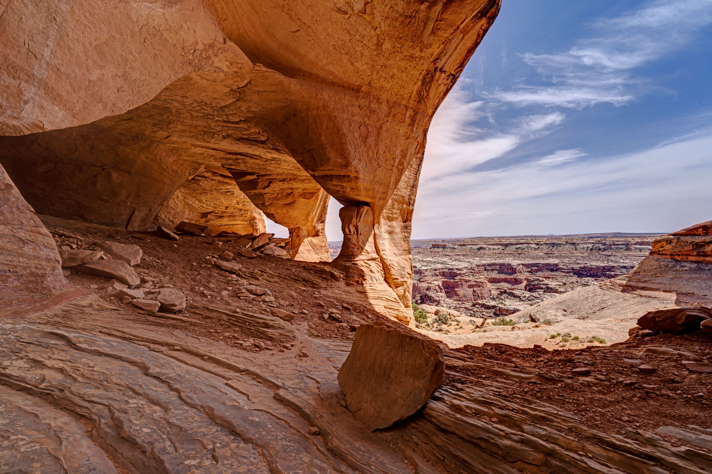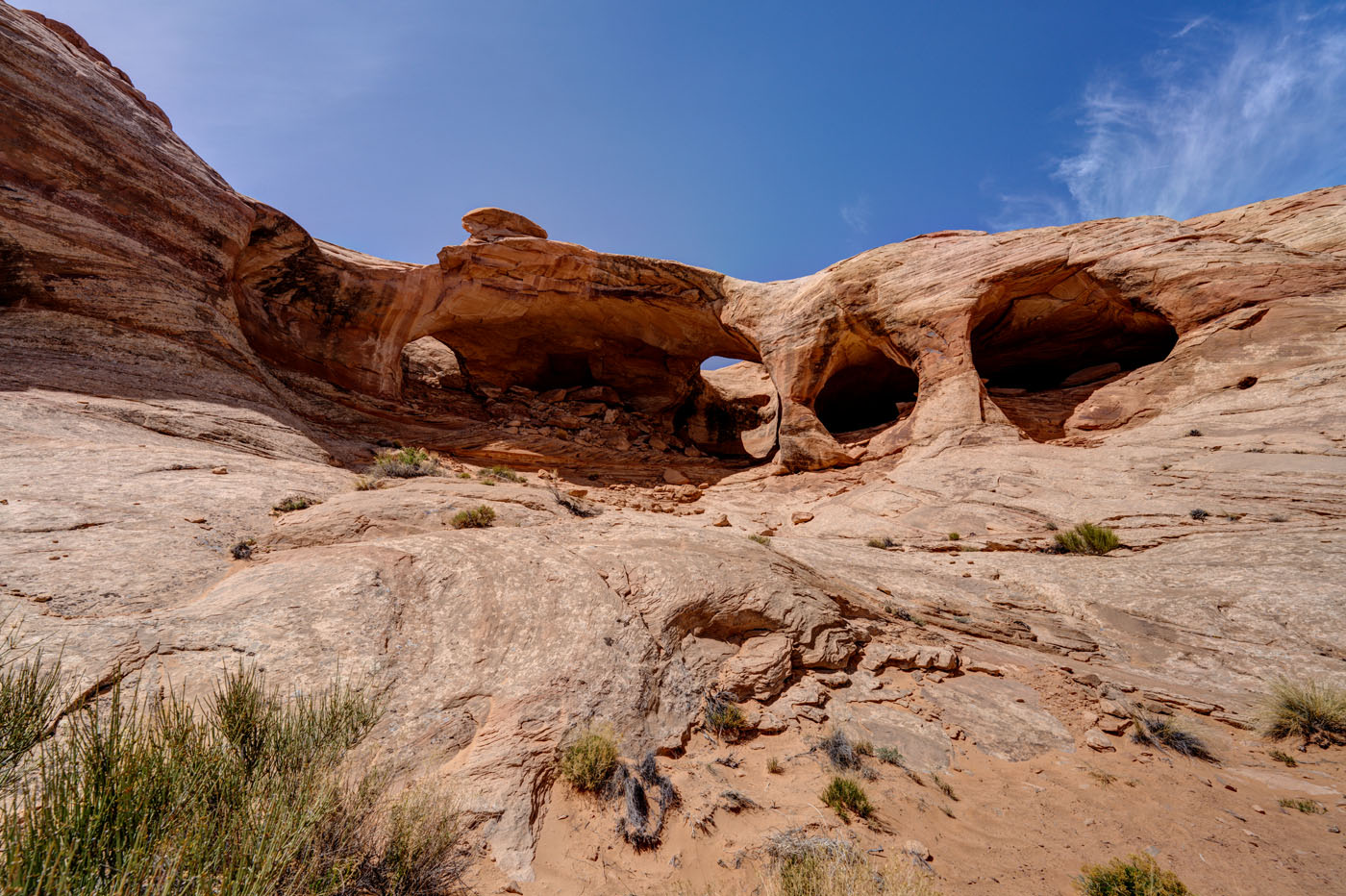 I also stopped at nearby trail for Colonade Arch or as it is also known Five Hole Arch. Located just outside the national park, the trail starts at the end of a 4×4 road located about 5 miles north of the entrance to Horseshoe Canyon. You simply turn north on Road 1010 as you exit the entrance road for Horseshoe Canyon and then make a right on the first signed road at the 5.2 mile mark. This short 3.5 mile road is very rough in spots with exposed rock sections. A 4×4 is definitely required (as a woman told me who I met at the trailhead, “Put some decent tires on your X5”). The trail leads north of the parking area out over a section of slickrock. It then follows an old road bed past a large wooden fence and continues northward for about .75 miles. The trail then veers eastward toward the Green River at a large cairned rock outcropping. The trail leads eastward for about .5 mile. The cairned route becomes hard to follow at points. The way leads steeply downward to a second level of slickrock (I had to clamber on hands and knees up a 10 foot section on the way back). Colonade Arch is then just around a bend to the left. The arch itself is impressive. It has four openings with a fifth being a pothole arch just in back of the main openings. Photos don’t do this place justice. The arches are quite large. I was impressed with this little known arch.