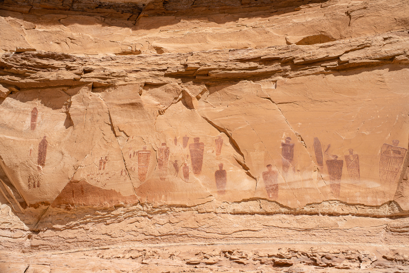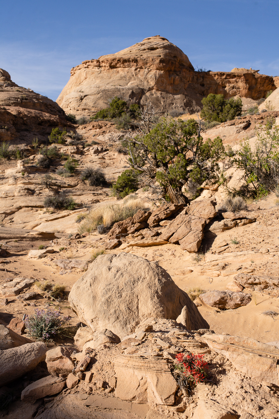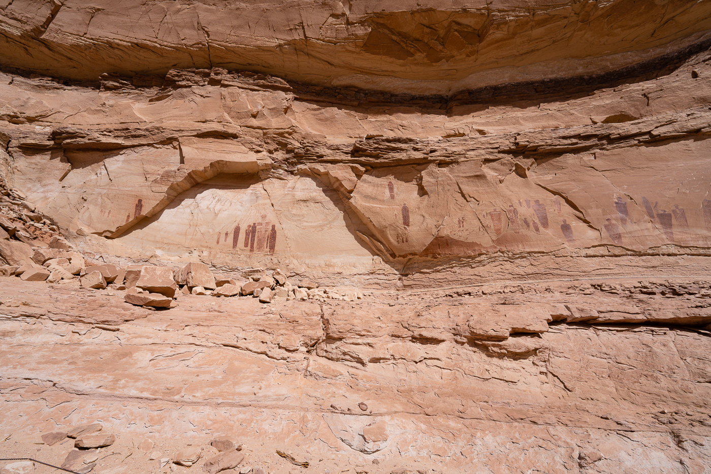 My trip started with a stop at the Horseshoe Canyon unit of Canyonlands National Park. This is where the Grand Gallery pictograph panel is located. It is in a remote part of the park that is located off a dirt road about 25 miles from the main highway. The hike itself is beautiful. Most of the hike is an easy stroll through the lush Horseshoe Canyon after descending a short slickrock slope at the start. The canyon is very verdant and a striking contrast to many parts of Canyonlands. The pictograph and petroglyphs start appearing about 1.5 miles into the hike. Several panels can be seen along the route. The most prominent ones are located in the Alcove at the 2.5 mile mark, and the biggest one is found in the Grand Gallery at mile 3.5. There were even a few wildflowers to liven up the hike.