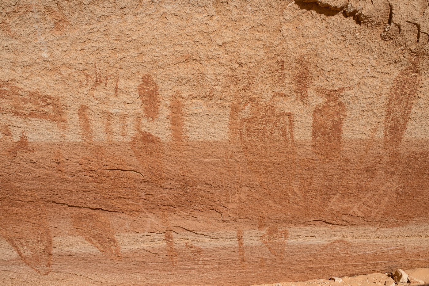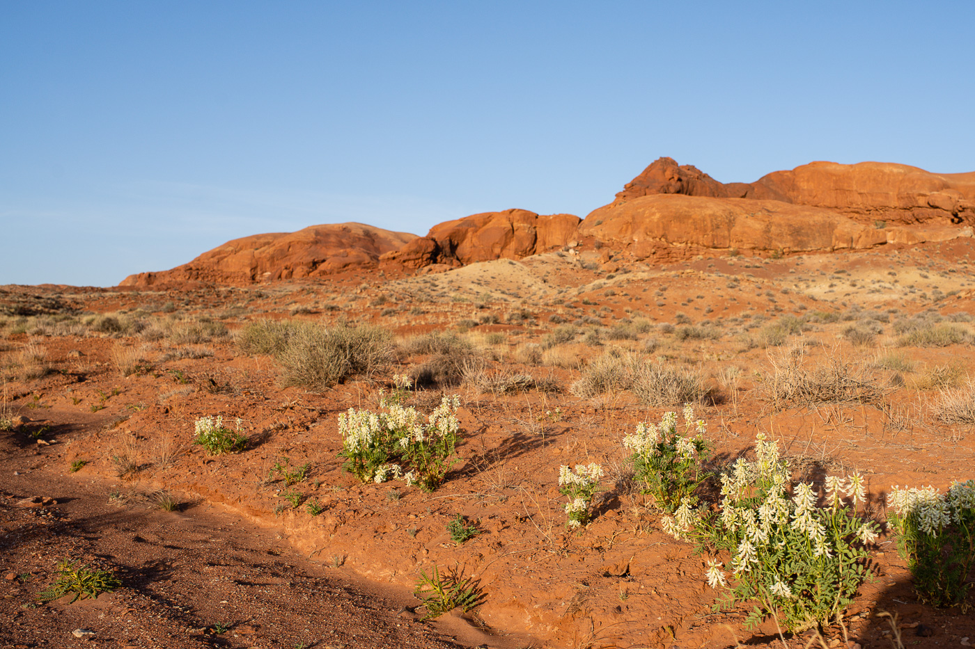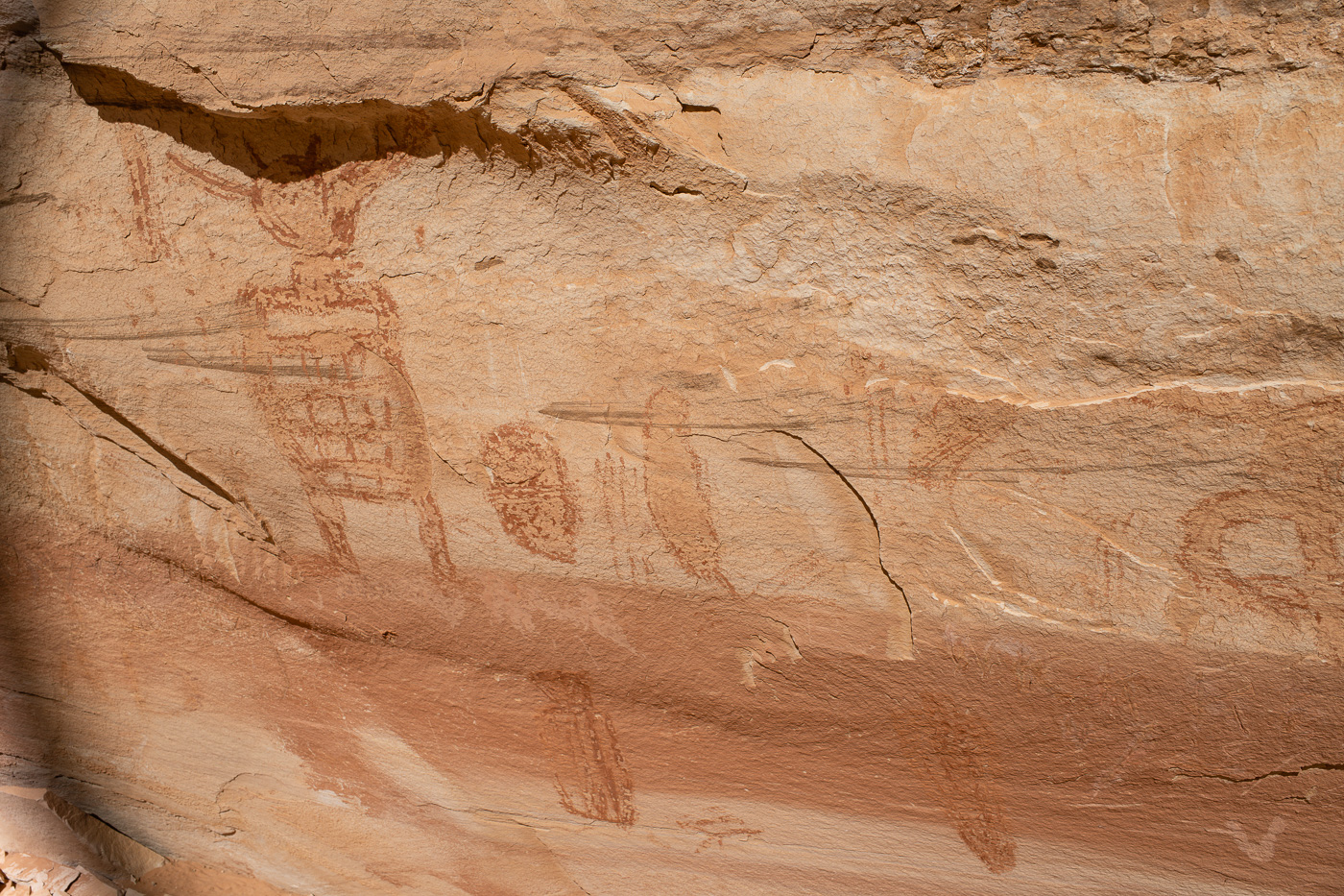 My trip started with a stop at the Horseshoe Canyon unit of Canyonlands National Park. This is where the Grand Gallery pictograph panel is located. It is in a remote part of the park that is located off a dirt road about 25 miles from the main highway. The hike itself is beautiful. Most of the hike is an easy stroll through the lush Horseshoe Canyon after descending a short slickrock slope at the start. The canyon is very verdant and a striking contrast to many parts of Canyonlands. The pictograph and petroglyphs start appearing about 1.5 miles into the hike. Several panels can be seen along the route. The most prominent ones are located in the Alcove at the 2.5 mile mark, and the biggest one is found in the Grand Gallery at mile 3.5. There were even a few wildflowers to liven up the hike.