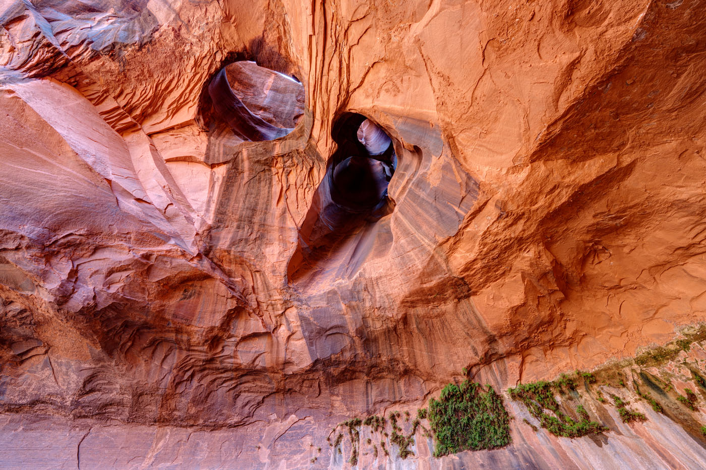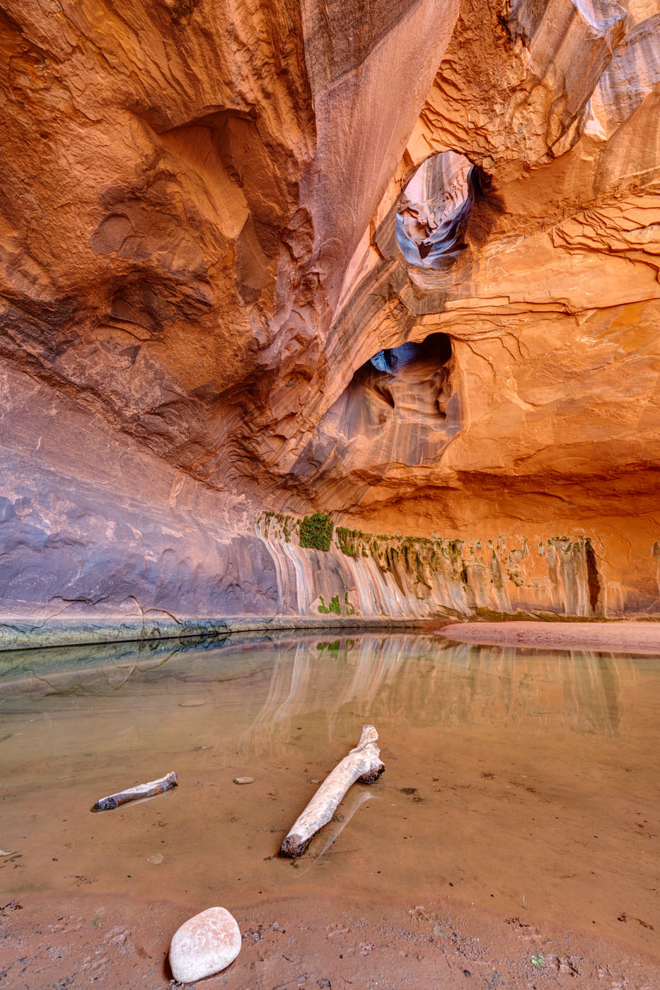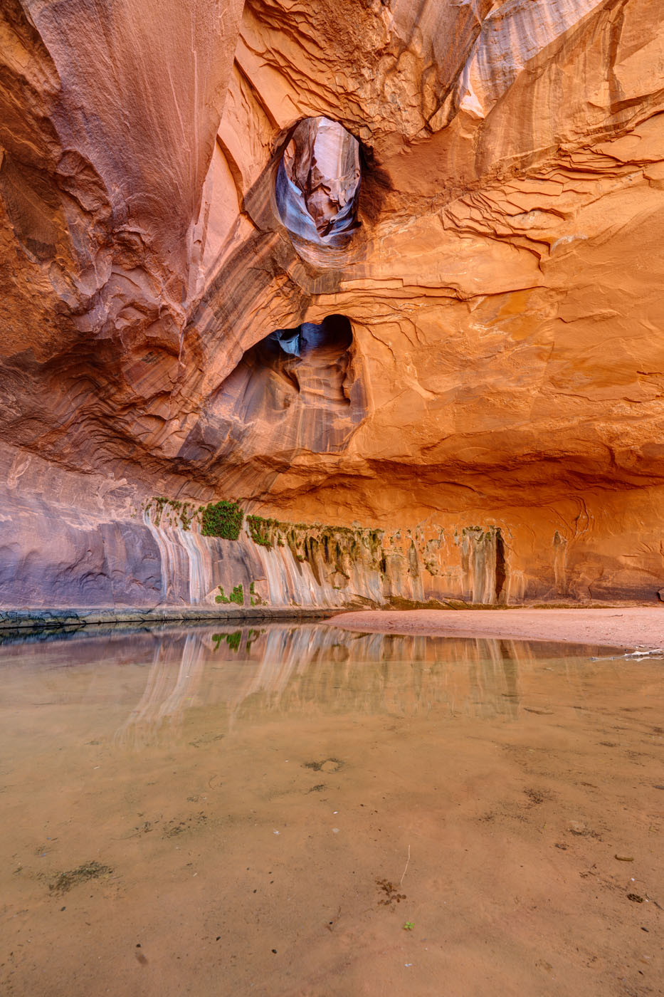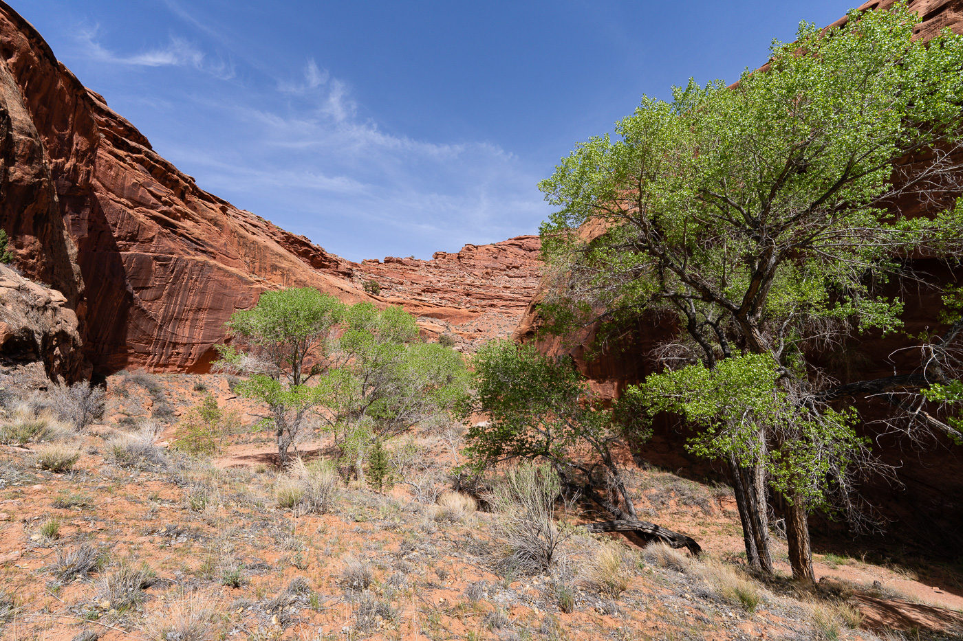 So was all this effort worth it? You bet. Neon Canyon is amazing. The end of the trail is marked by the Golden Cathedral, two large holes in the striped canyon ceiling of Neon Canyon. Canyoneering experts actually repel through these holes on their way down Neon Canyon. I have never seen this done live, unfortunately, but it would be a sight to see. From the Escalante River, Neon Canyon itself is about a mile walk and it is a beaut. The reflected light makes the canyon walls glow a gorgeous shade of orange. The newly leafed cottonwood trees made this especially pretty in April.