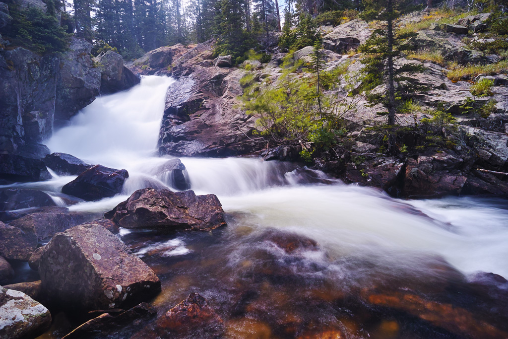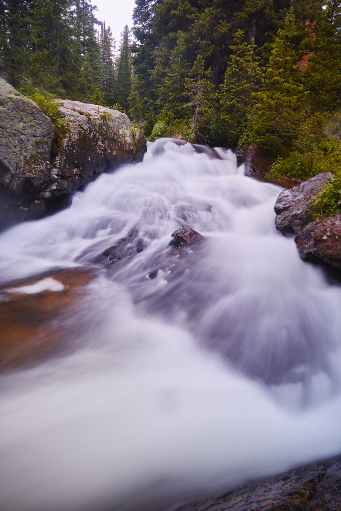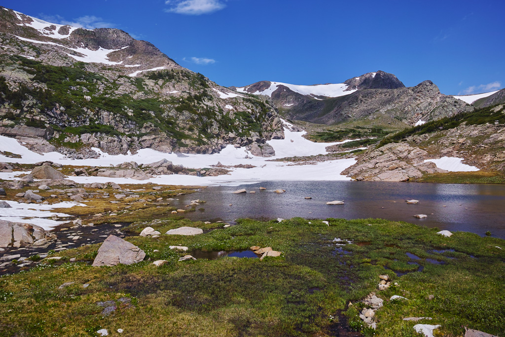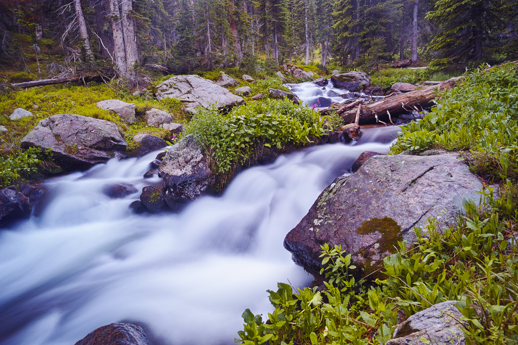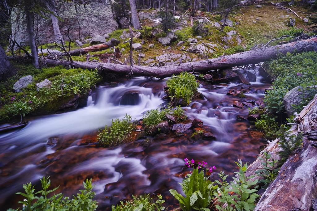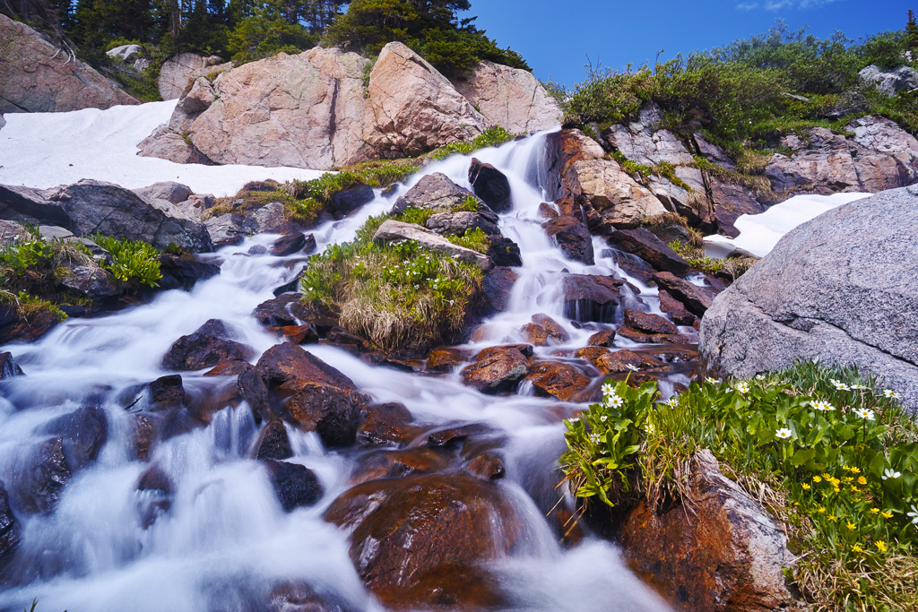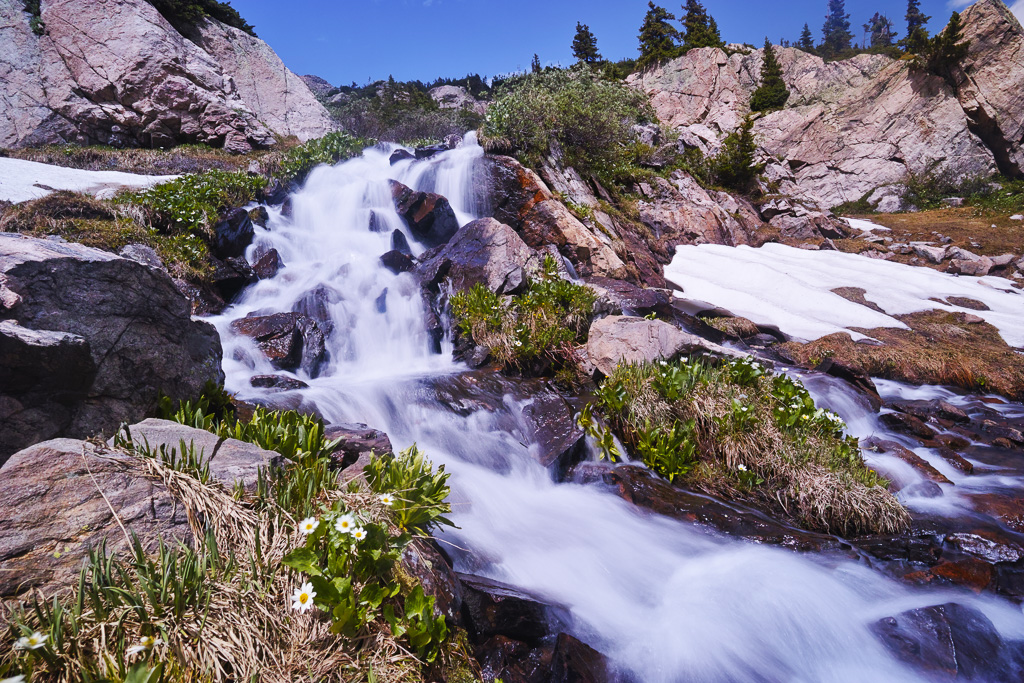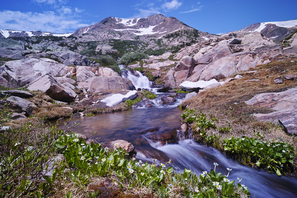 The long hike to King Lake in the Indian Peaks Wilderness is worth the effort. Near the end, you are rewarded with great views, rushing water, and abundant wildflowers. Getting there requires a 6.5 mile hike from the Hessie Trailhead near Nederland, CO. The trail begins steeply as it climbs over a rocky slope before reaching a trail divide after 1.5 miles. Veer left (the right branch goes toward Jasper Lake). The trail crosses the creek and climbs past a beautiful waterfall. You reach a trail divide again at mile marker 2.5. Keep straight. Then the trail enters the forest and climbs only gradually for the next three miles. Not many views are found during this portion of the hike. Finally, the trail joins up with the creek again at around mile 5.5. The next mile is steep as it switch backs up to a meeting with the Betty and Bob Lakes trail. Just past the junction you have to cross the creek to reach King Lake. In high water, the creek can be crossed easier to the right and then skirting back to the trail through some large boulders. Finally, after a long hike, you reach the pretty shores of King Lake.